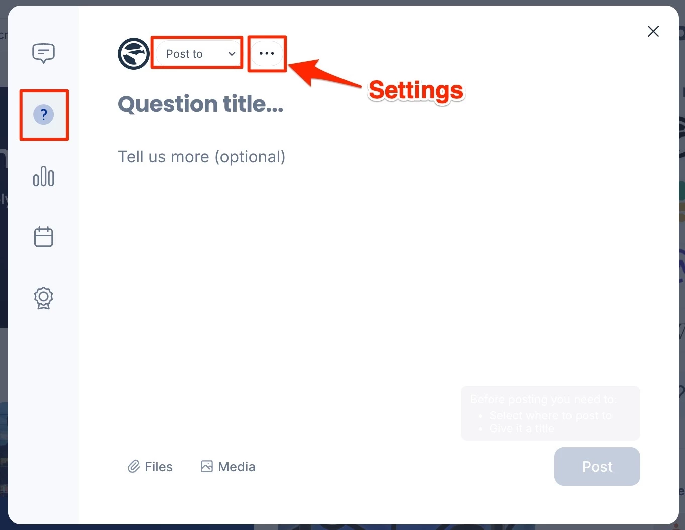 - In the Question window, click the Post to drop-down menu and type in the name of the community to search.