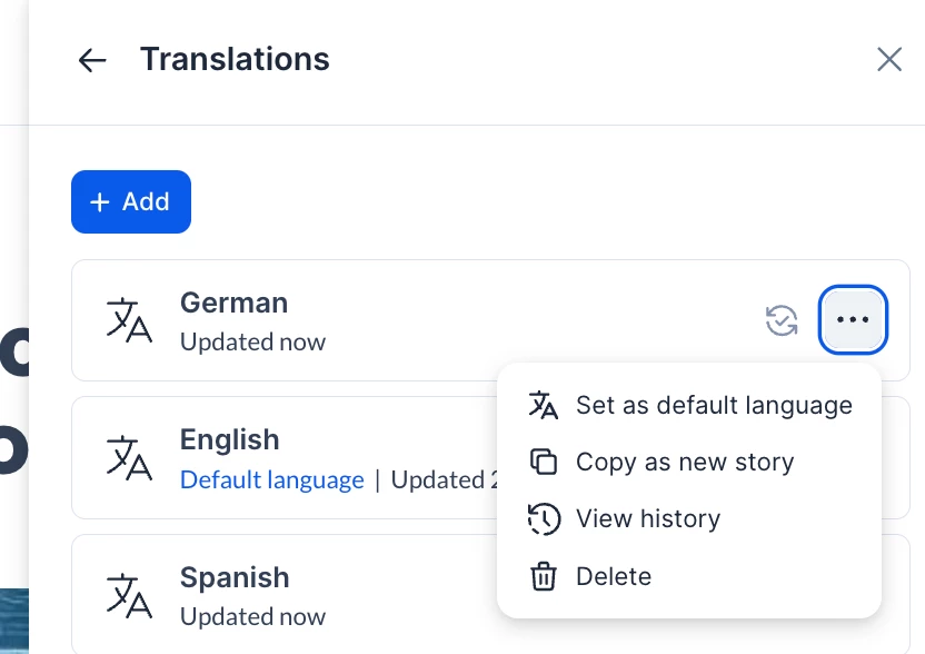 - Set as default language – Set this translation as the Story’s default language. This option is available for translations other than the default.