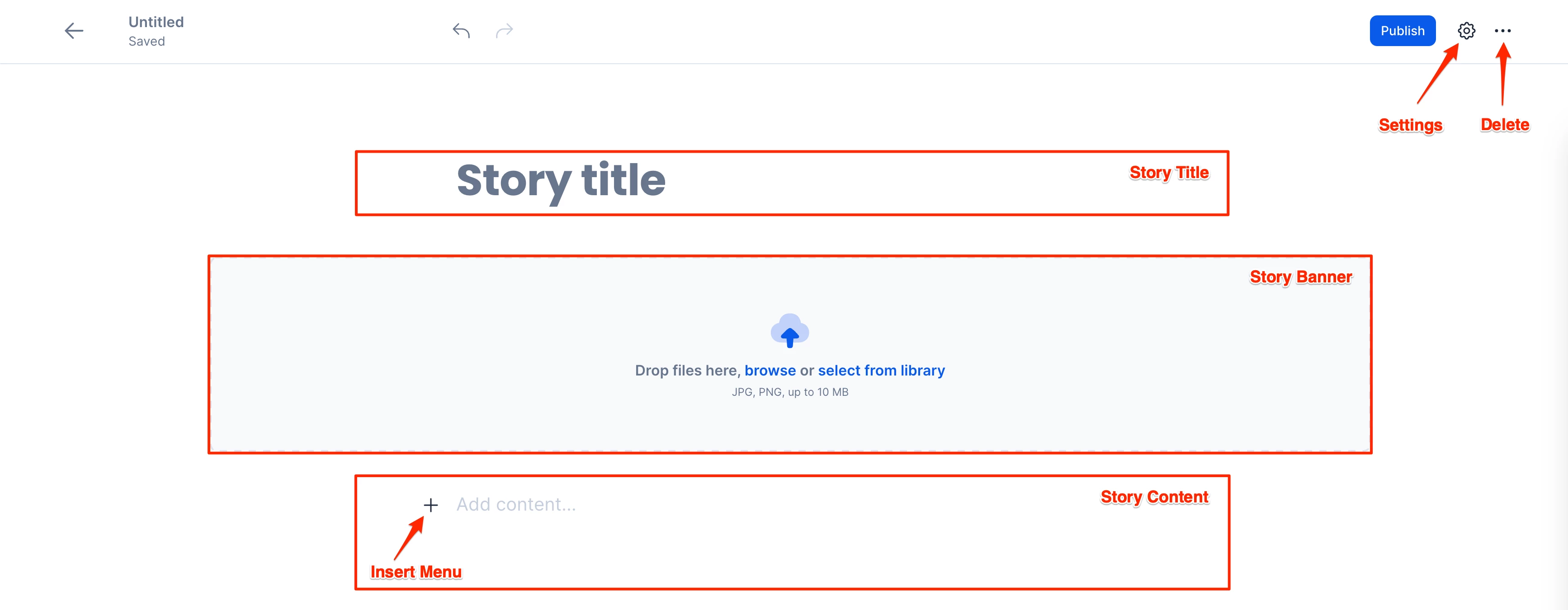 - Once you have completed writing your Story article, click the Settings Gear icon to configure the publishing options and metadata of the Story.