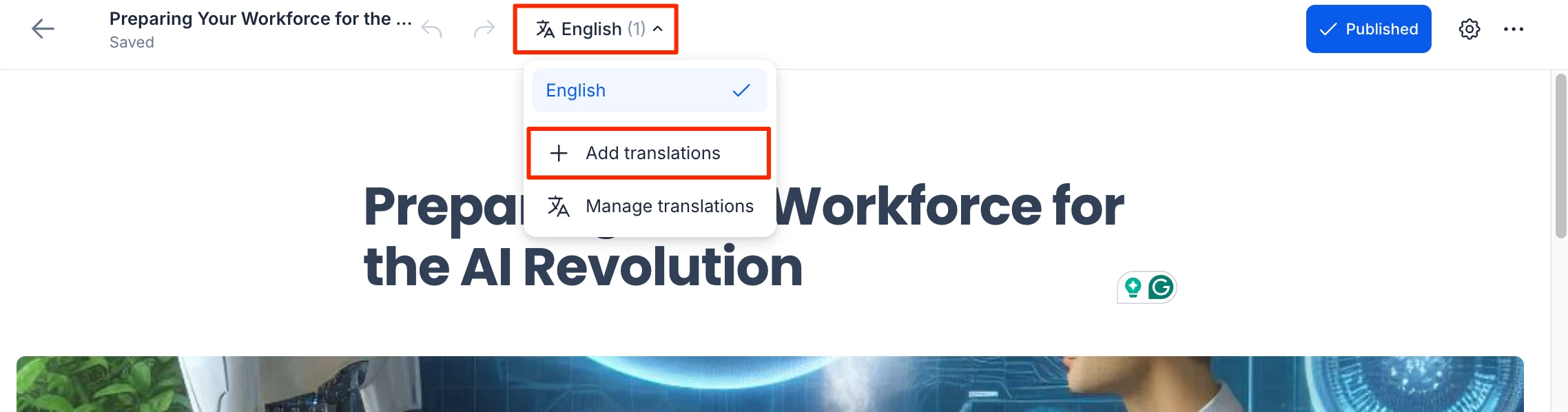- After that, click Add Translations and select to enable the supported languages in the drop-down list. You can either use AI to translate the selected languages or manually translate the content yourself in the editor.
