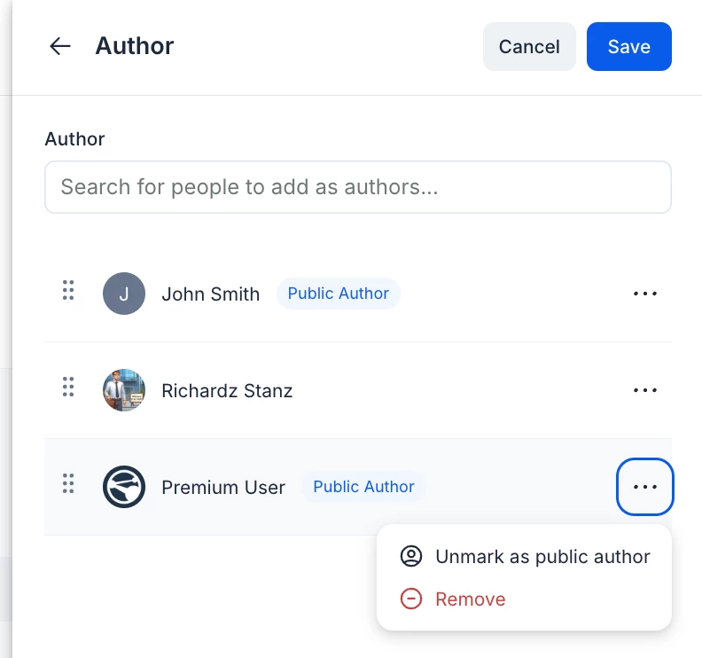 - (New) After adding more than one author, click the ellipsis on any author and select Unmark as public author to hide the name from the author list. Note that at least one author must remain visible as Public author.