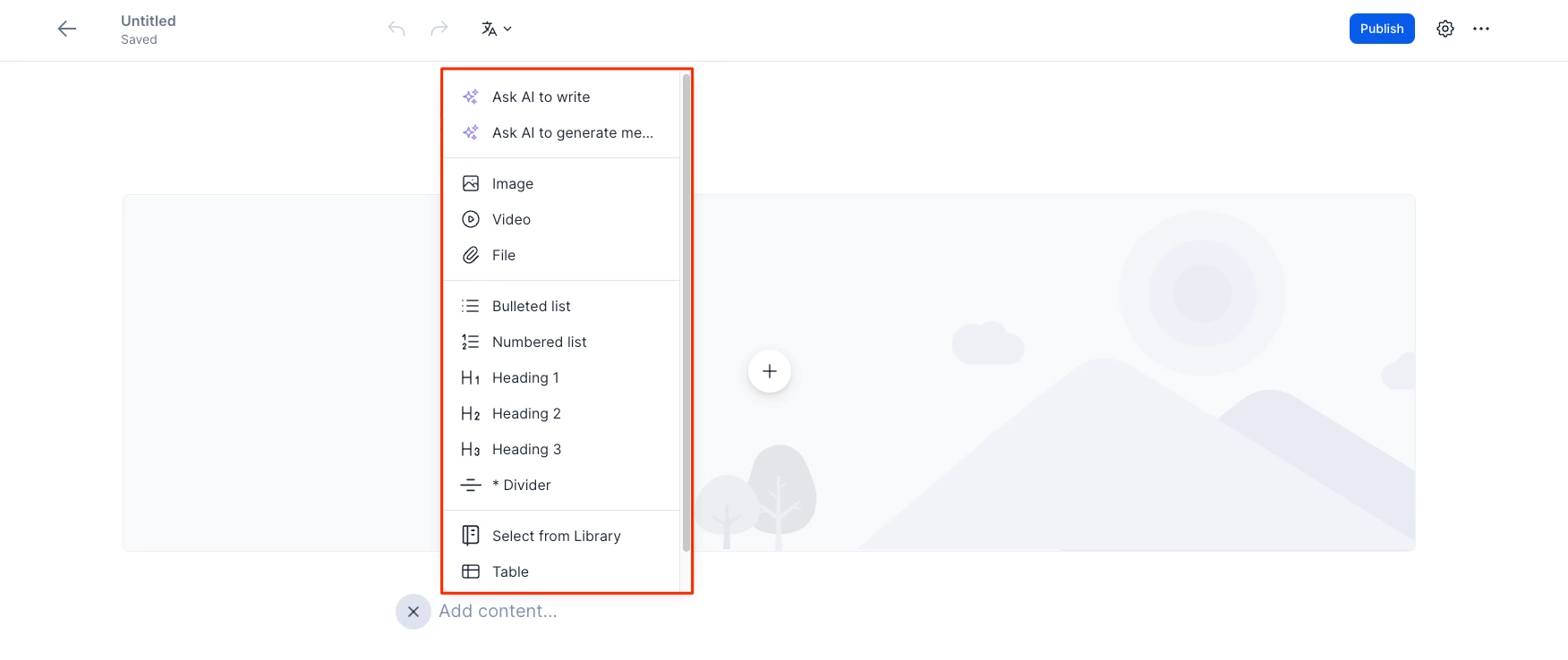 - Ask AI to write content or generate an image. Refer to the Ask AI to write or Ask AI to generate image options below.