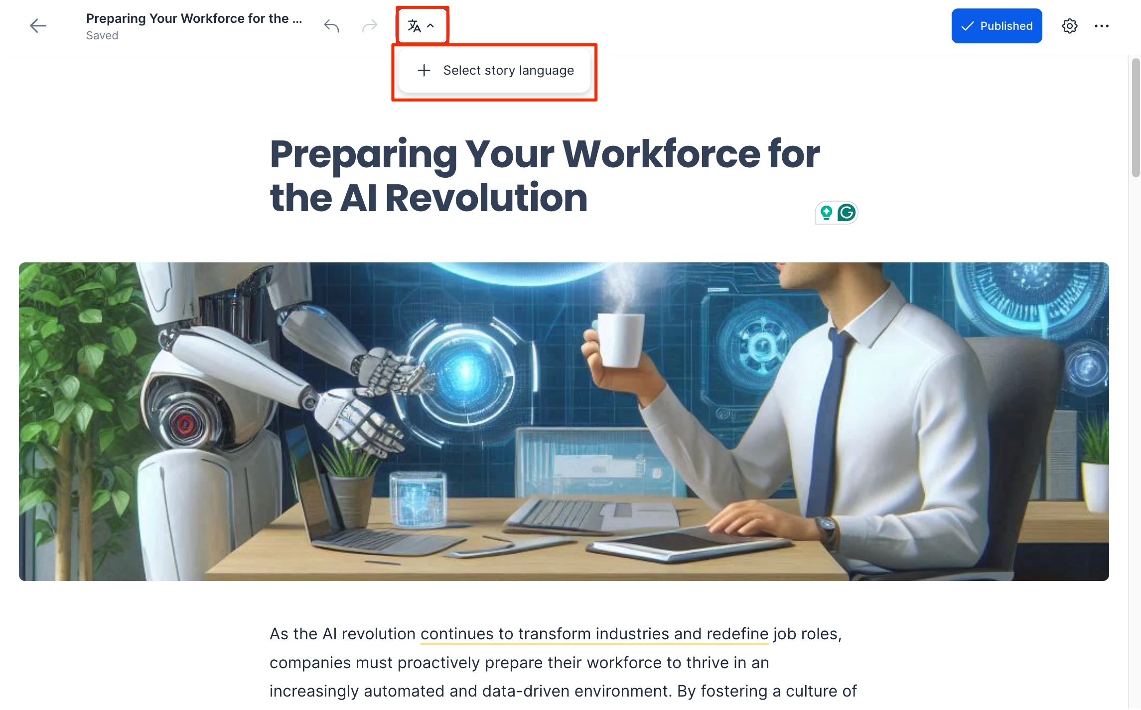 You can create translations of stories to offer content in multiple languages for international readers. You can also translate stories using AI if the AI Translation setting is enabled in the Administrative Console.