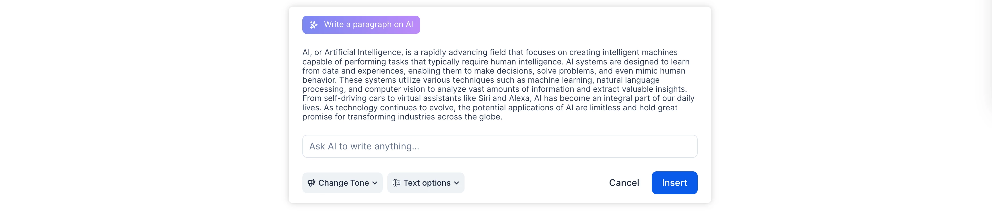 - Generate Text – Highlight an existing sentence or body of text, and click the AI icon from the text toolbar to re-generate that part of the text to be replaced, or inserted in the highlighted section.
