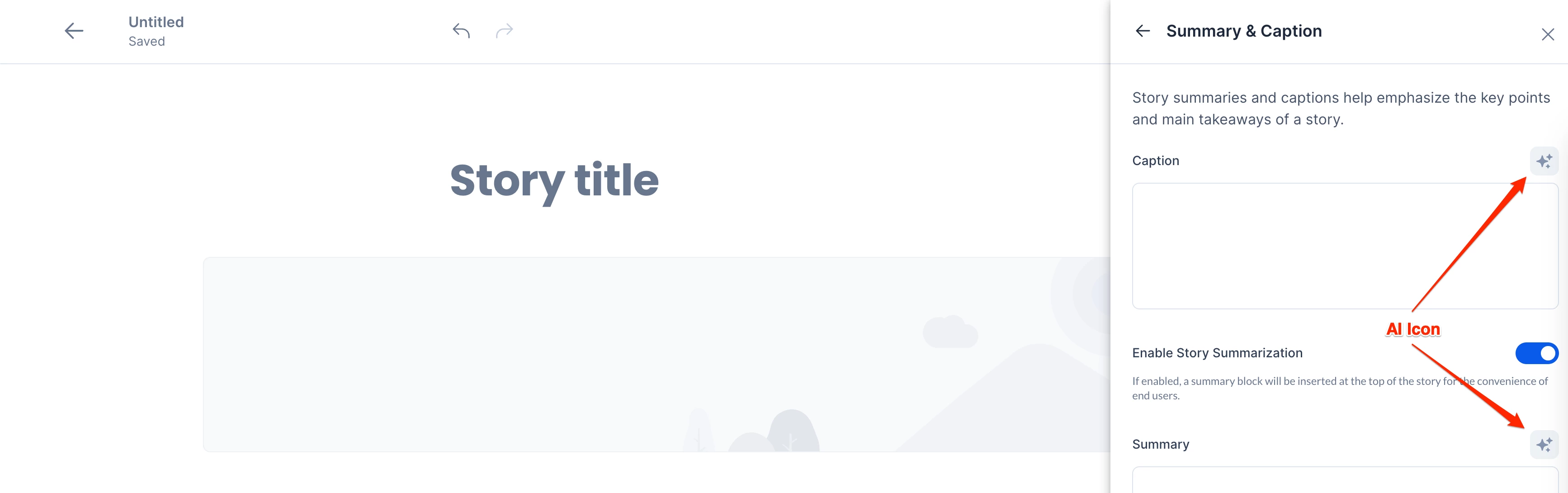 - Utilize Artificial Intelligence to generate a summary based on the Story article, by clicking the AI icon. The caption will be generated in the language set above.
