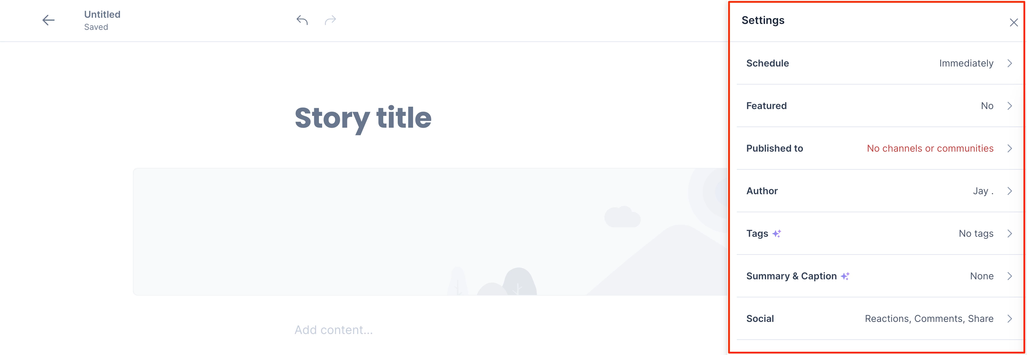 - Tags – Add tags to the Story for content organization, searchability, and contextualization.