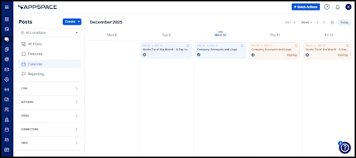 | Admin Console | Posts → Calendar | All content scheduled across your assigned location(s). Filterable by time frame, content type, author, feed, connector, and tag. |