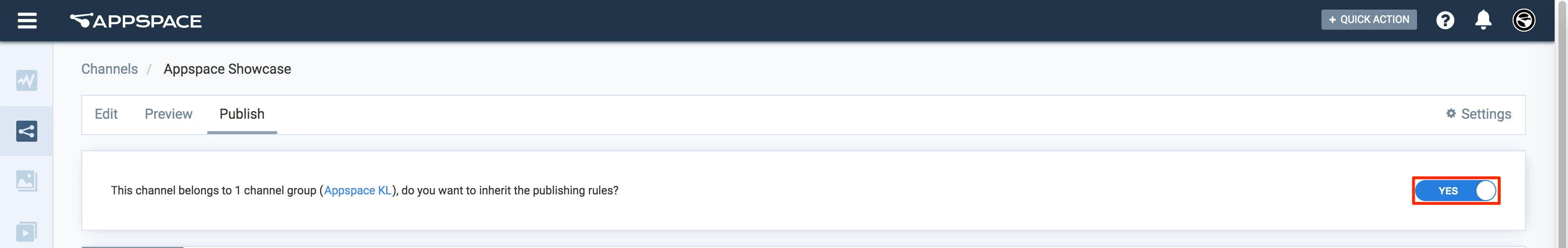 If the channel or channel playlist belongs to any channel group that is published, the channel or channel playlist automatically inherits the publishing settings from the channel group. However, you may still assign additional users, user groups, networks, devices, and device groups.