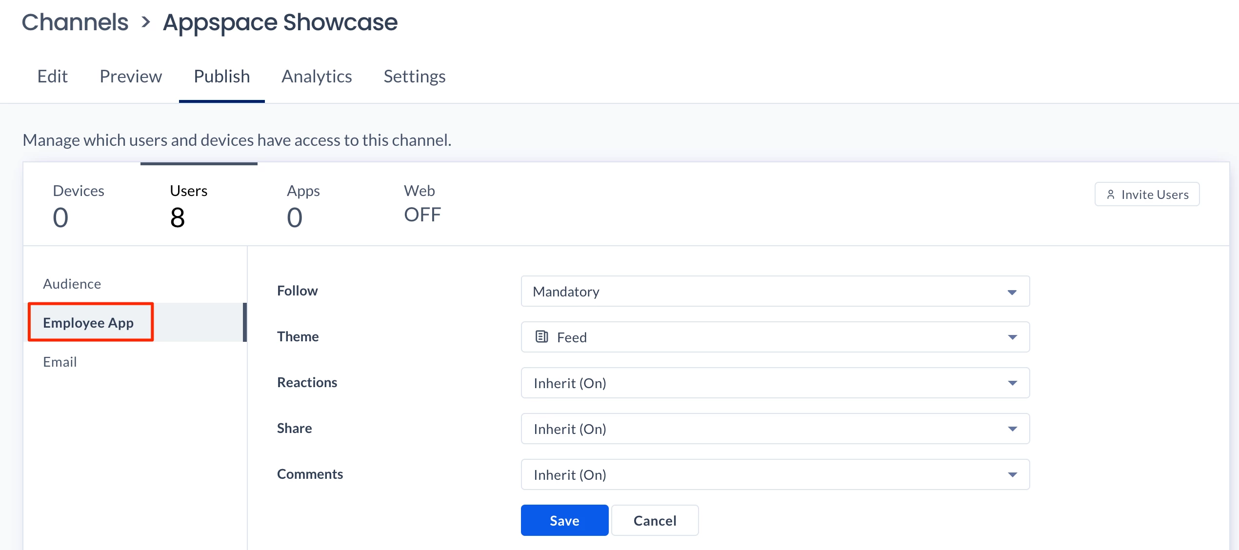 Follow the instructions below to publish a channel to users and their email addresses, so that only registered Appspace users would be able to browse and view the channel on their emails and the Employee View, either via the portal on a web browser, or a mobile device.