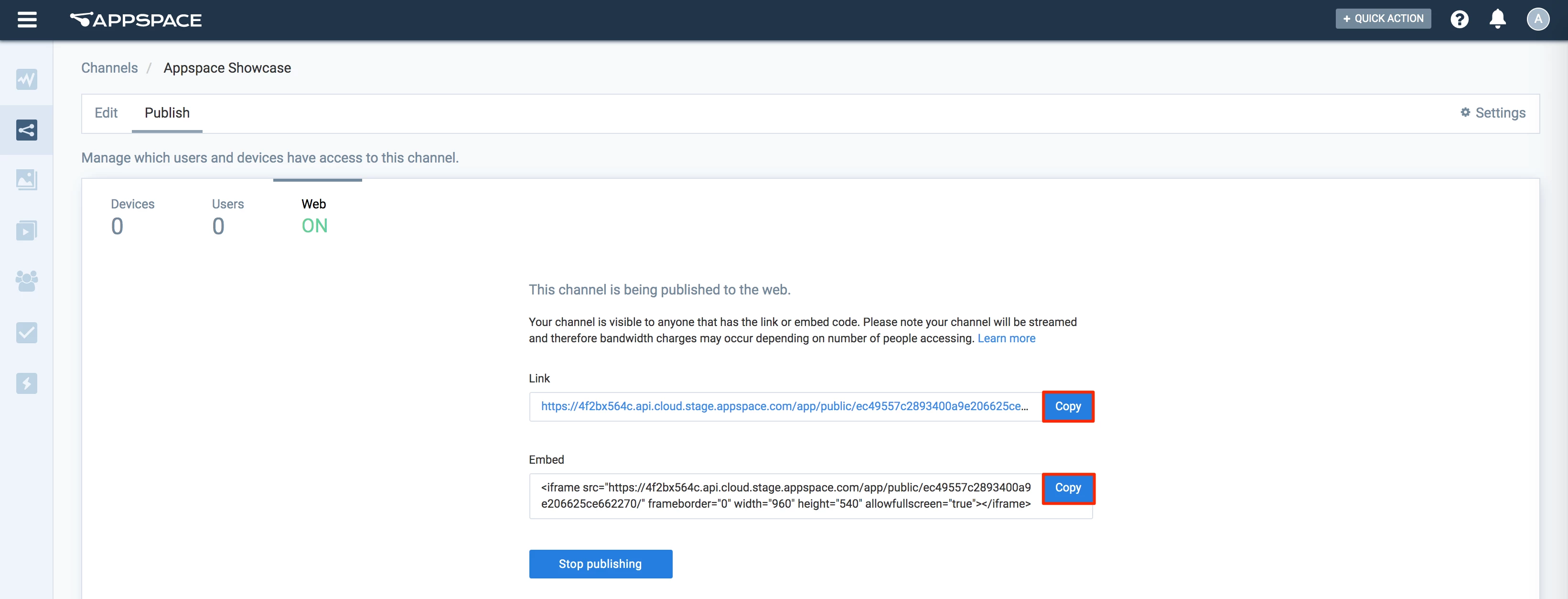 - When a channel is published to the web, a public link to the channel is accessible by anyone via a browser. Users do not need an Appspace account to view the channels. This method is recommended for quickly sharing content with remote workers or clients, or can be used for demo purposes. Channels viewed via the web link will be streamed, incurring bandwidth overhead, and thus we recommend using this option prudently.