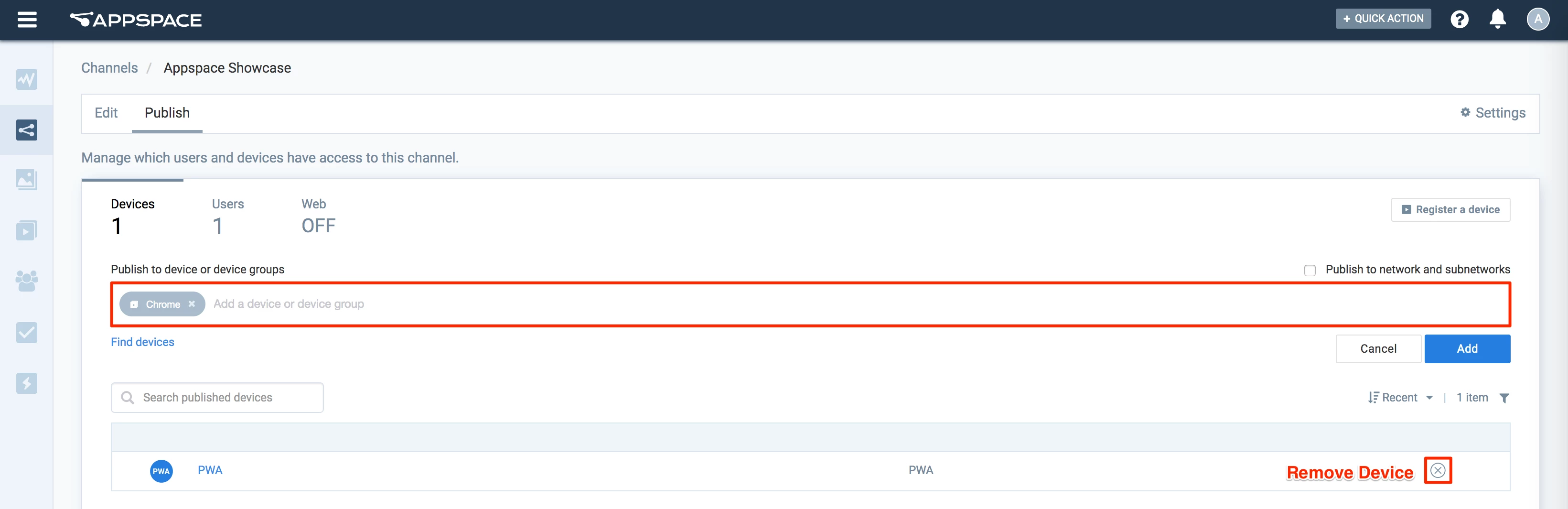 Follow the instructions below to publish a channel to individual devices, device groups, or devices in an entire network, so that only devices registered with the Appspace App will be able to display the published channel: