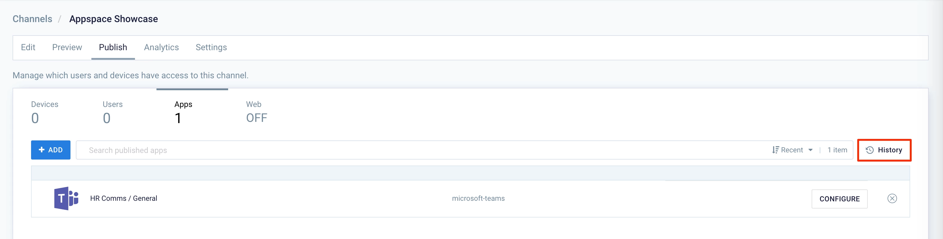 Publishing to Apps is only available for playlist channels. Appspace Account Owner or Publisher permissions are required.