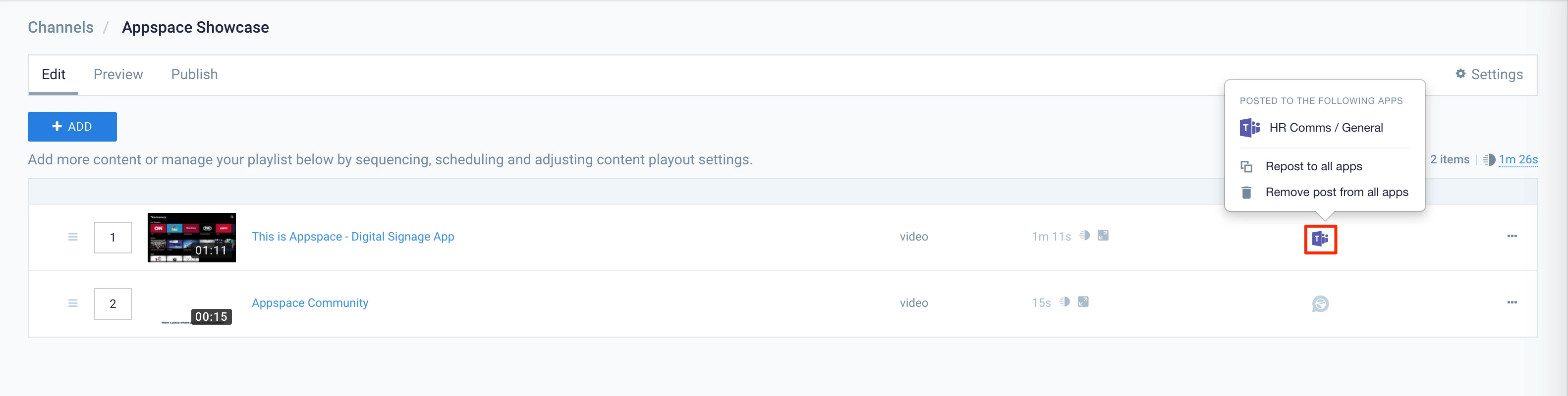- In the Edit tab, click +ADD, and select, create, or upload content to the playlist channel.