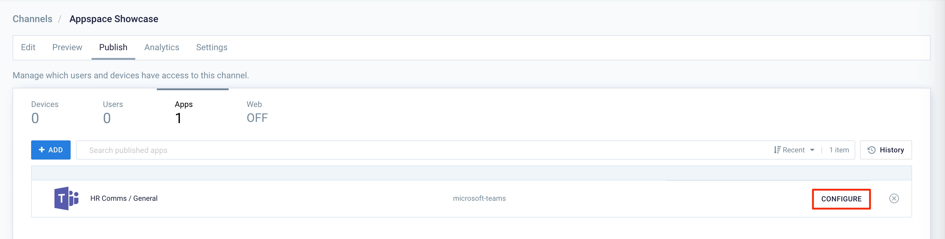 - Click CONFIGURE on the selected Microsoft Teams app integration.