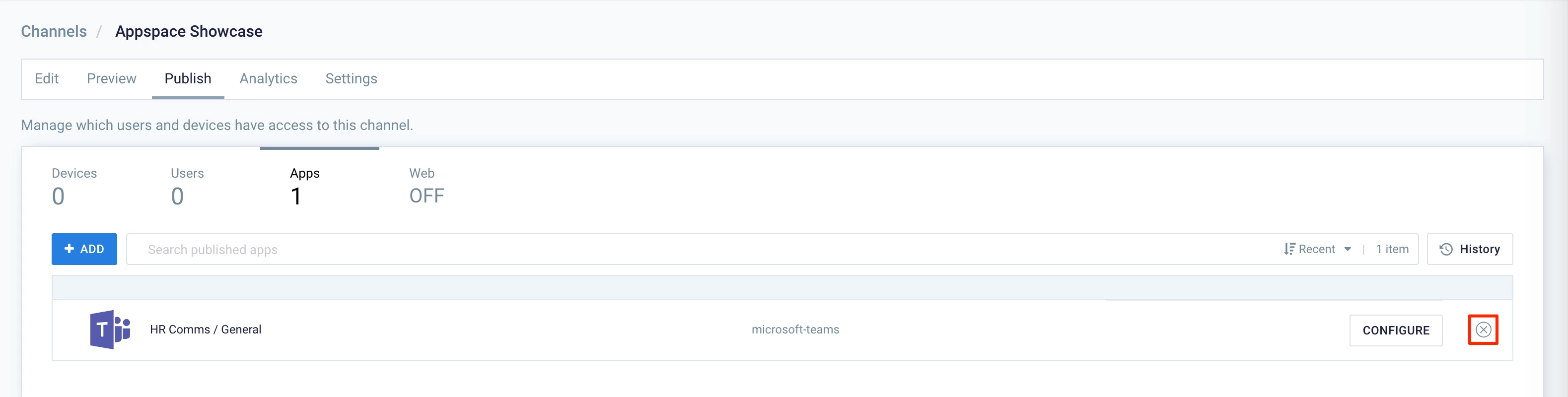 - Click the Publish tab, and click the Delete icon next to the selected Microsoft Teams chat room.