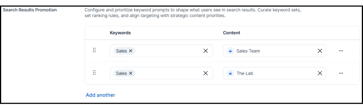 - In the Search Results Promotion section, add keywords and select the pre-existing content you wish to promote in search results.