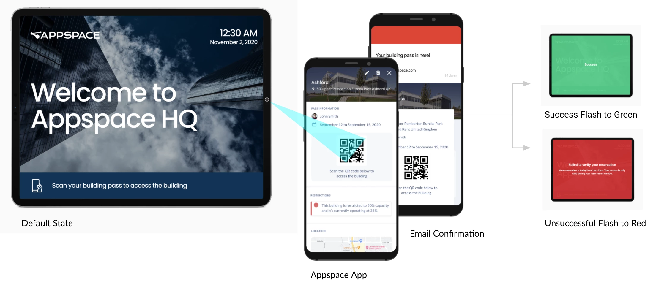 The selected devices will now be able to utilize the device camera to scan the building pass QR code (as in the image below) displayed on a mobile device running the Appspace Mobile App.