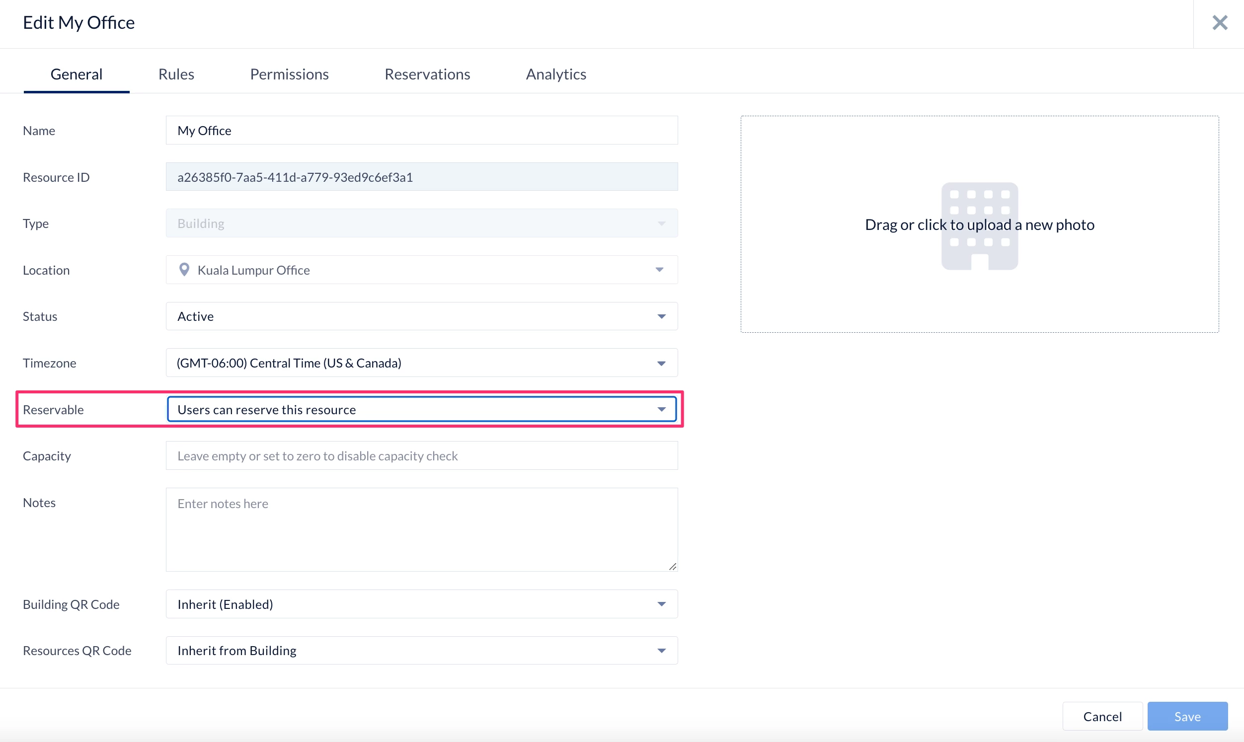 - In the General tab, under Reservable, select Users can reserve this resource from the dropdown list.