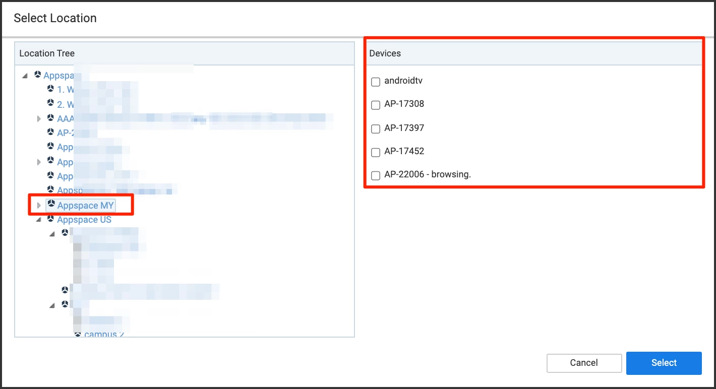 - In the Select Location window, select a location, select one or more devices that you wish to deploy this device task to, and click the Select button.