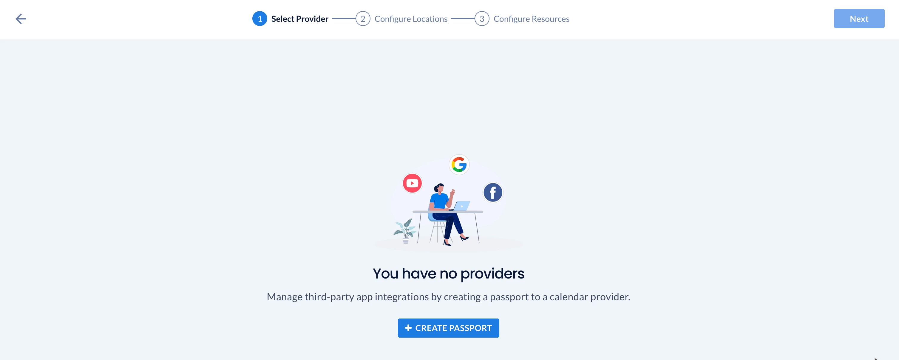 - In the Connect to an App to create a Passport window, select a calendar provider and click Next.
