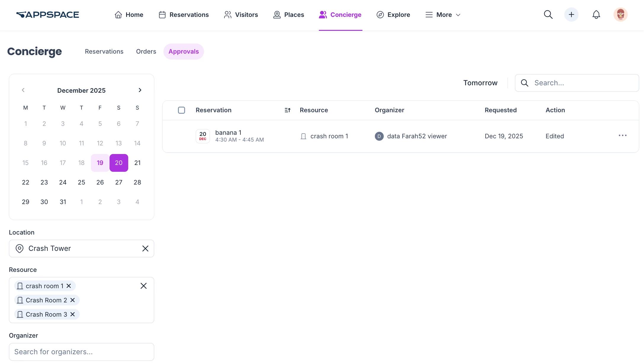 - Under the Concierge section, click the Approvals tab. The approval list will display all reservations within the selected Location according to the date on the calendar.