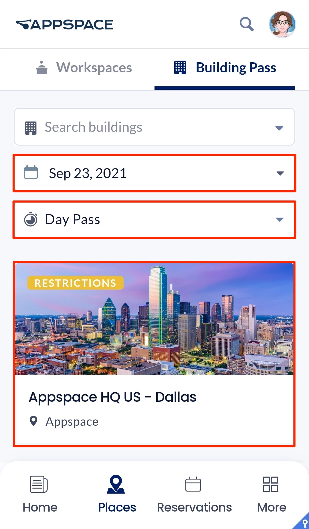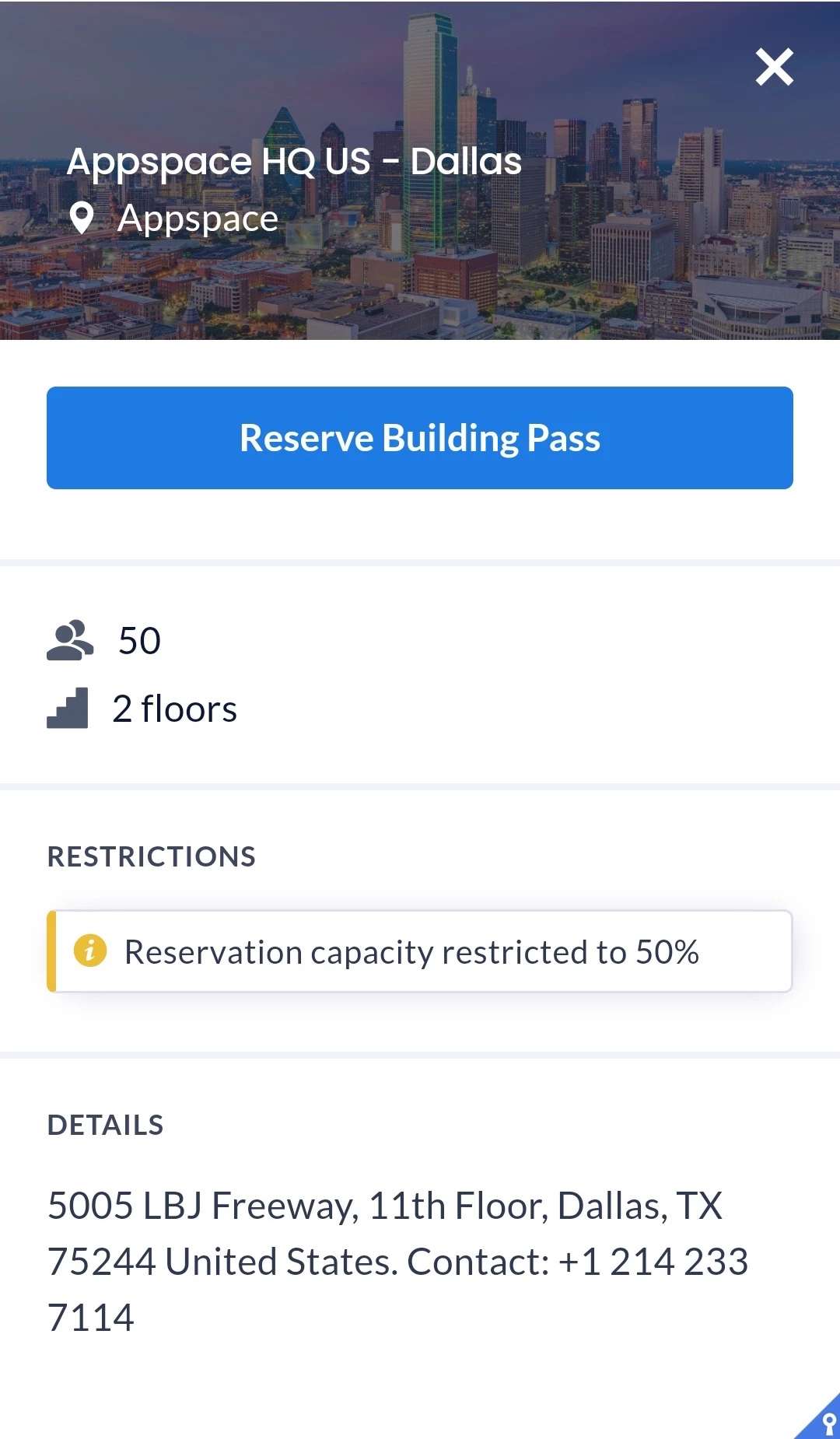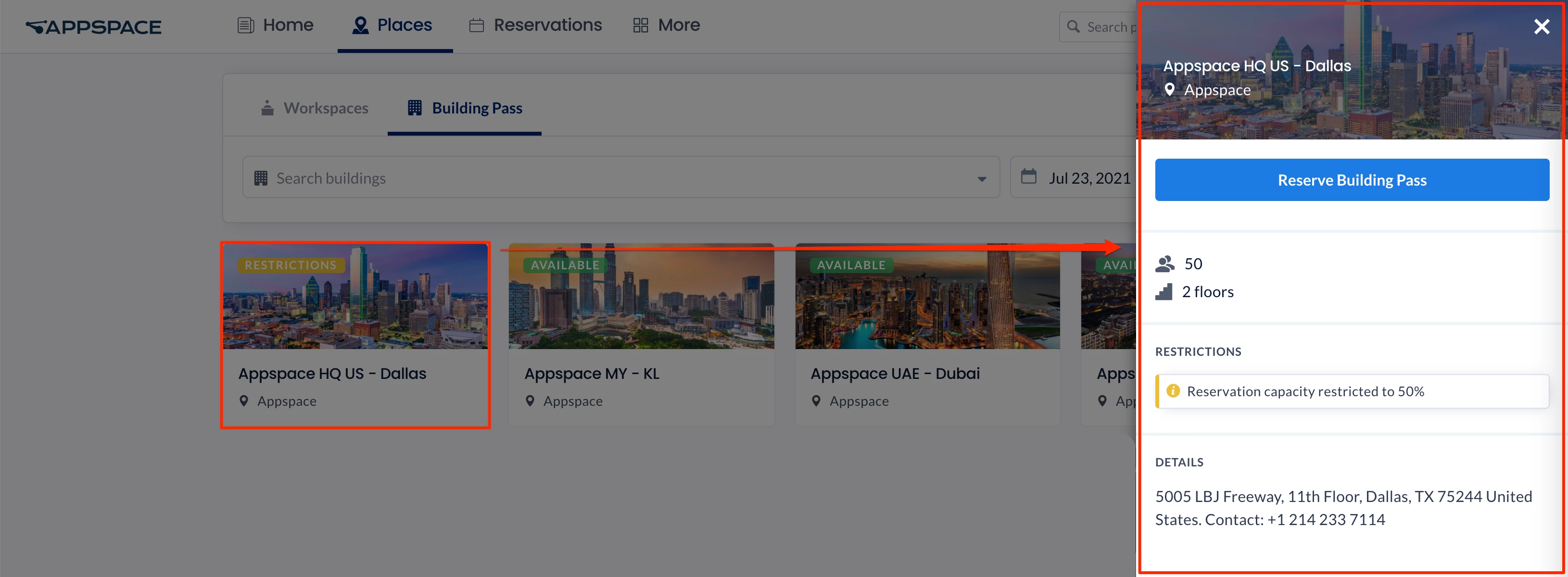 - Click the Reserve Building Pass button to make the reservation. You may also view any restrictions that may have been configured for the building here.