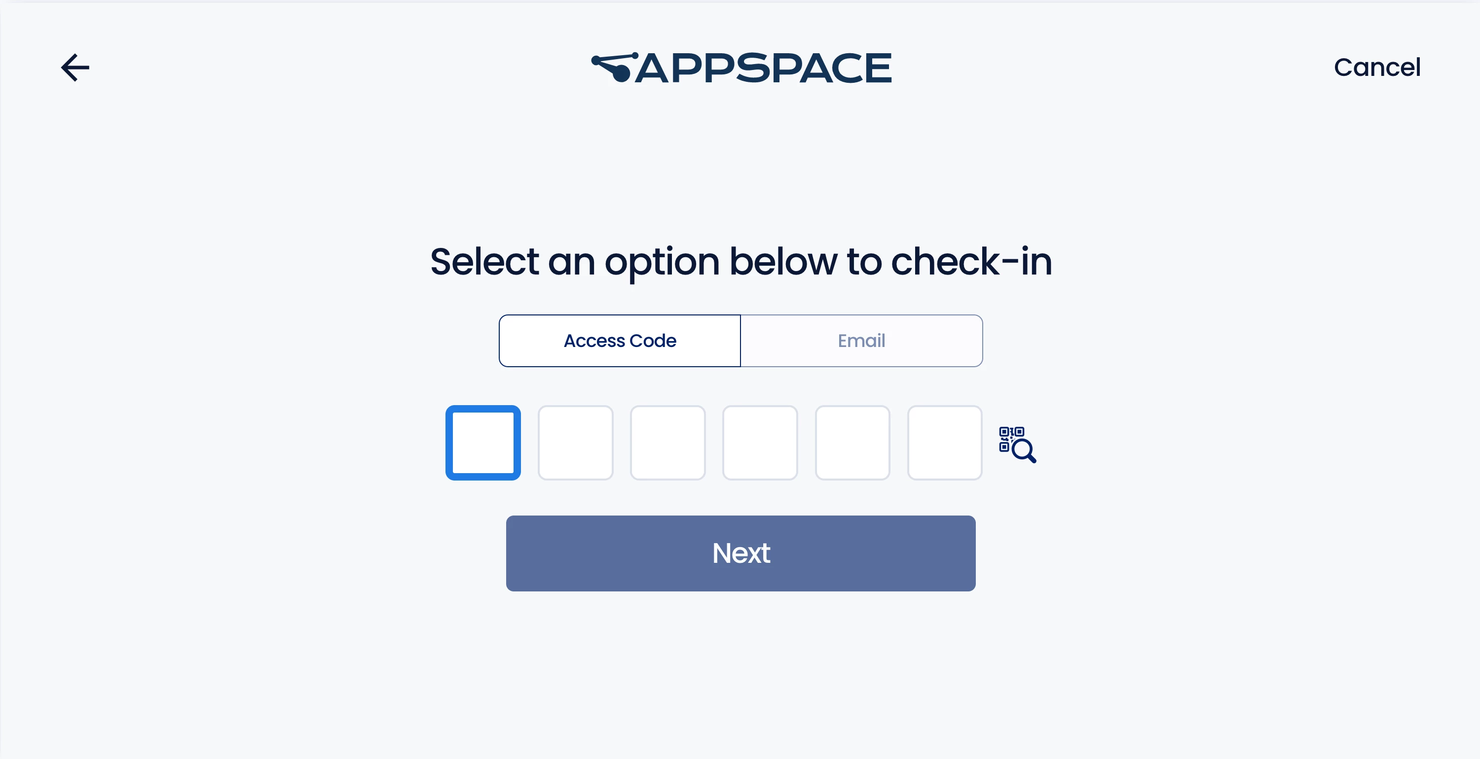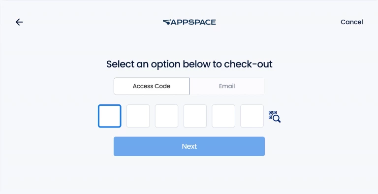 - Enter your 6-digit code obtained in your visitor invitation, or enter the email address the invitation was sent to, and click Next. Optionally, you may also click the QR Scan icon to go back to the initial Visitor Kiosk screen to scan your QR Code.