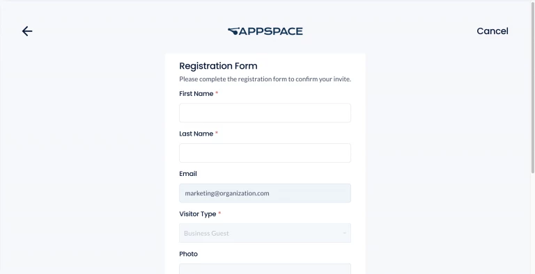 The Appspace Visitor Management system is used to invite external users (visitors) to a meeting or event held at your company. These visitors could be an employee from another facility, division, or subsidiary within your company or other corporate entities from outside the company.