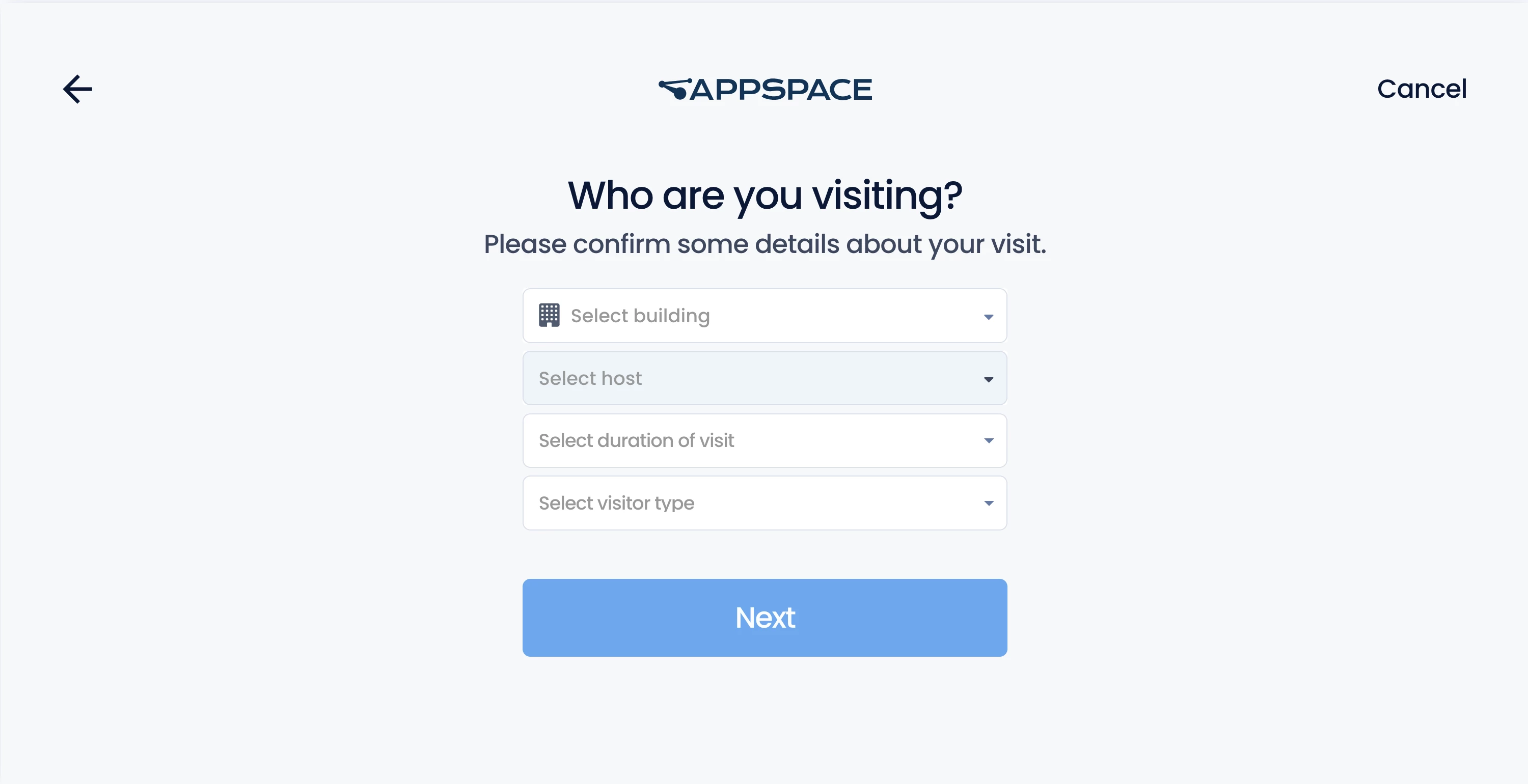 - Select host – Select the person that you are visiting. Only hosts with their location set in the building are listed.