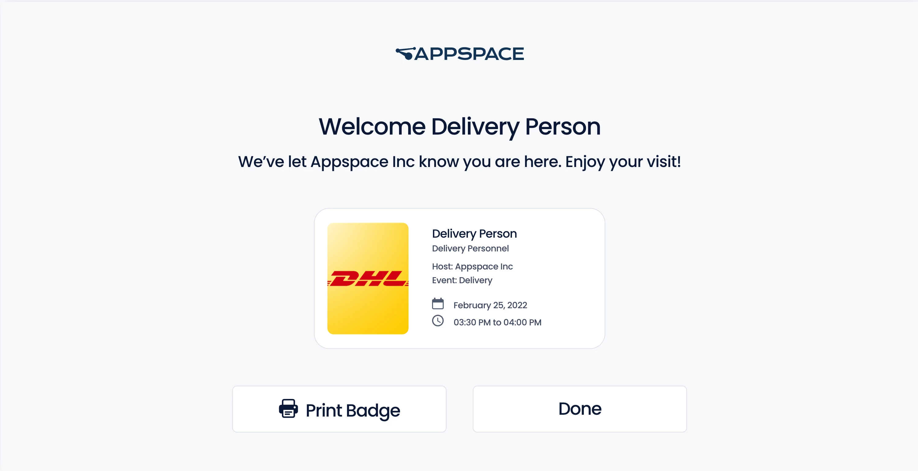 The Visitor Kiosk card is used for kiosk check-ins with the Appspace Visitor Management system.