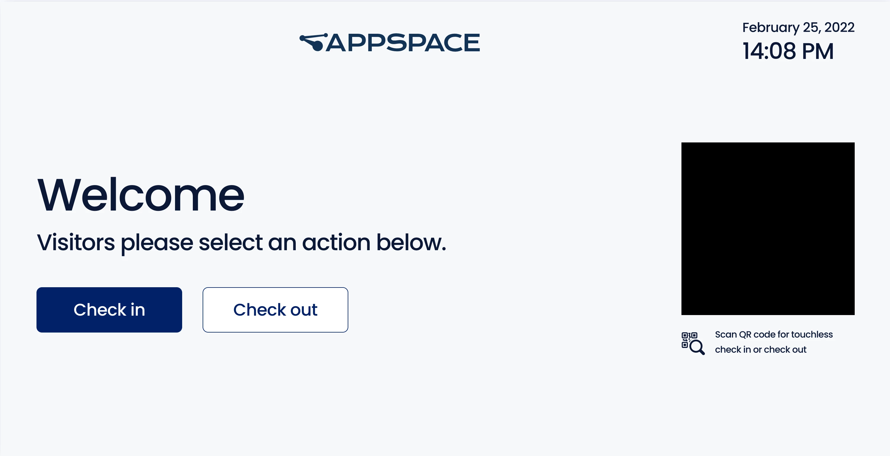 - The kiosk must have a webcam installed to scan a QR code for touchless check-ins.
