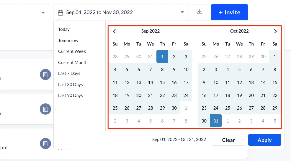 - Select the date range (start date and end date) for the invitations. Click Apply.