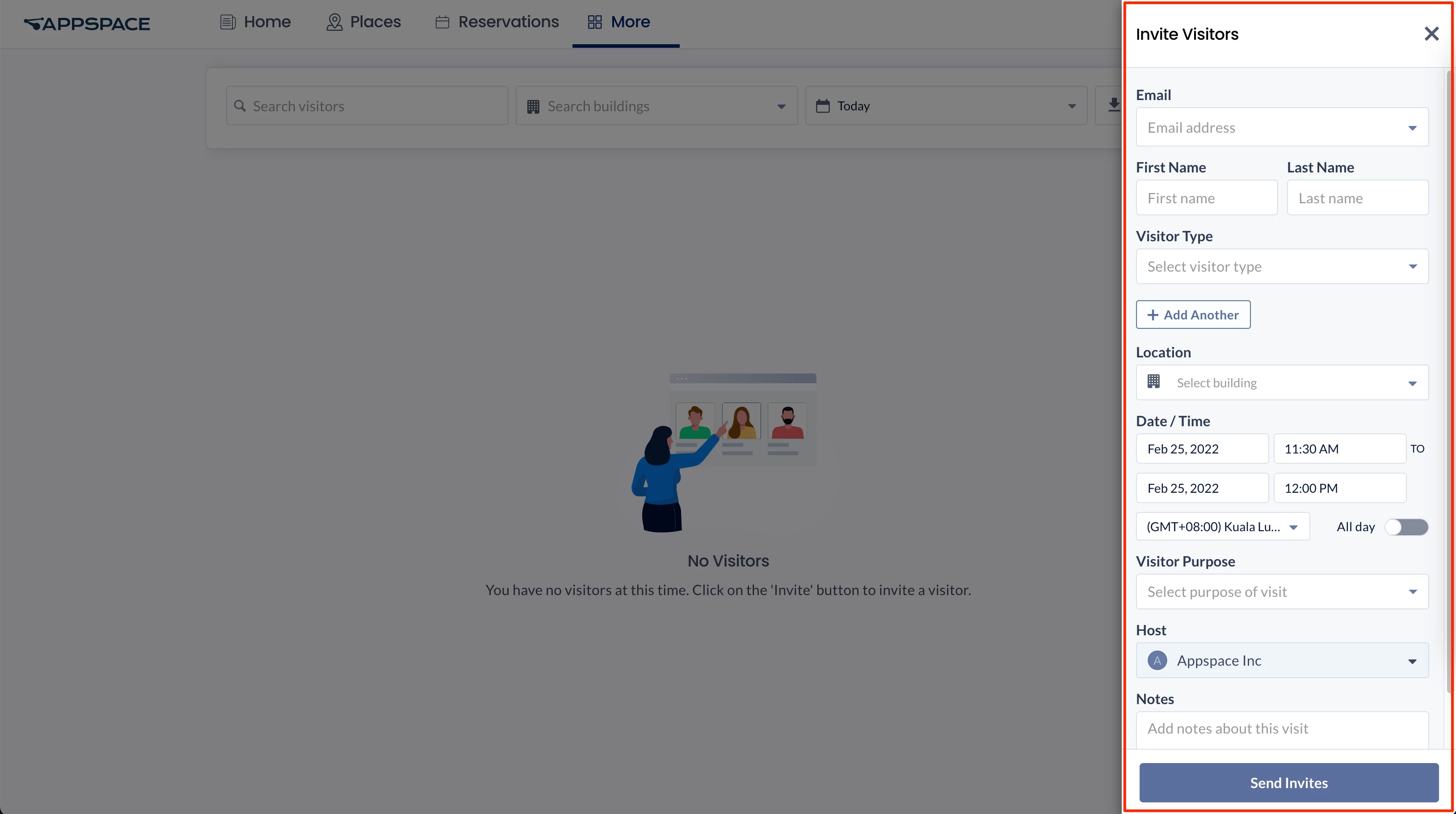 Follow the instructions below to send visitor invitations via the Appspace Employee Experience: