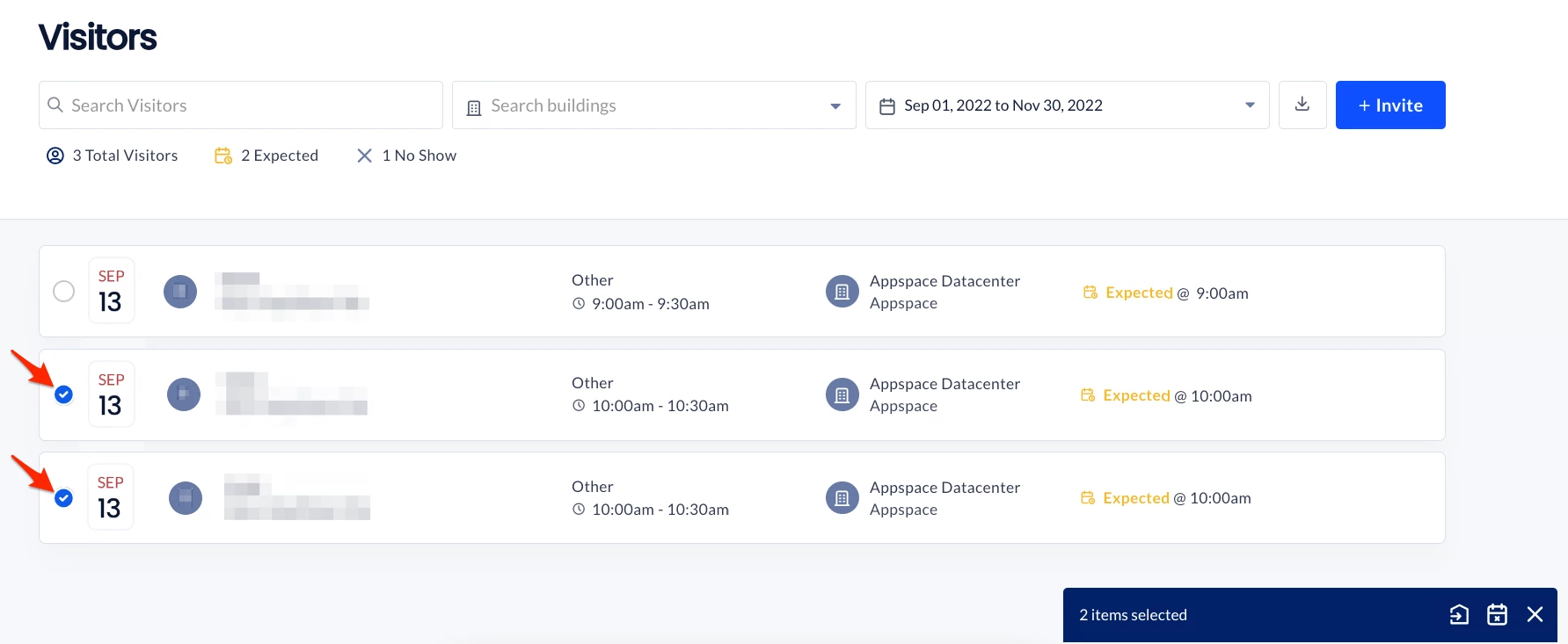 - Select multiple visitors to perform check-in/check-out, print badges, or cancel/delete invitations in bulk.