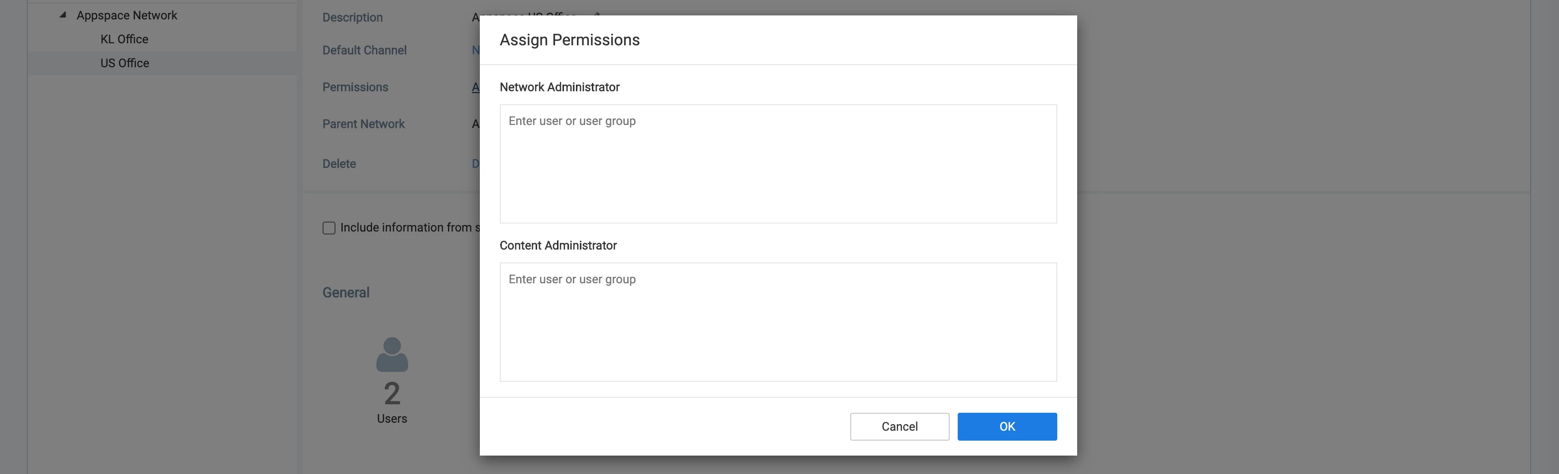 - A Network Administrator can assign a Network Administrator or Content Administrator to users to the network.