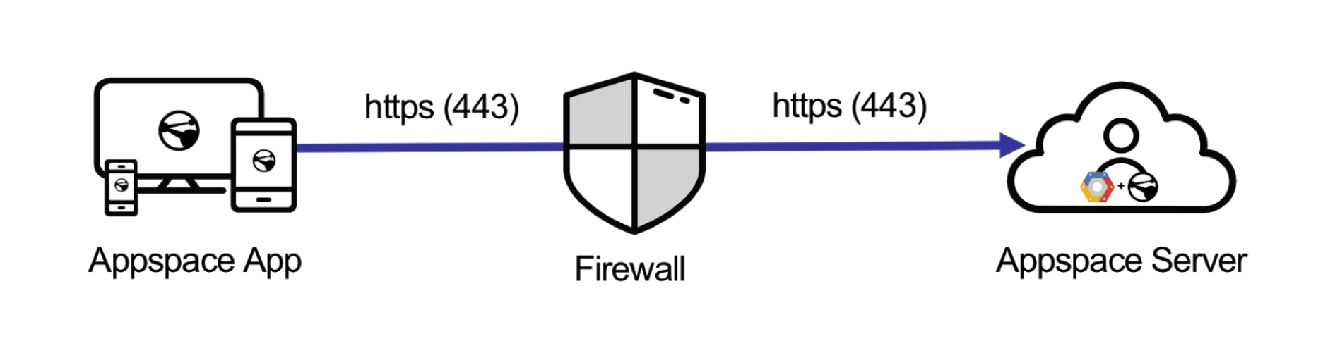 In a default deployment scenario, every device with an Appspace application communicates with Appspace cloud servers directly and downloads its own copy of content or streams content using secure HTTPS web protocols (Port 443).