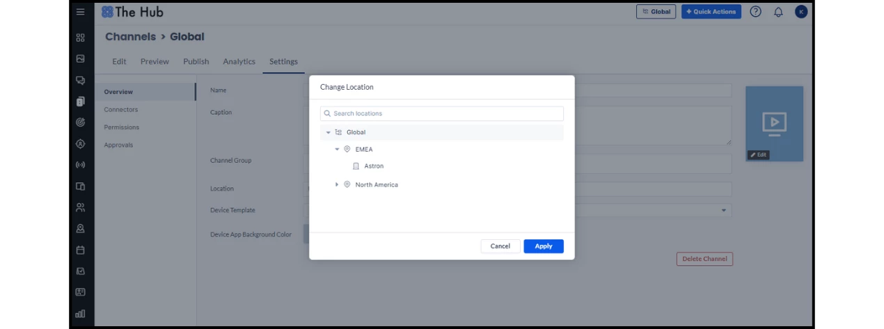 - Click the Location section and select the location you want to move the channel to and then Apply.