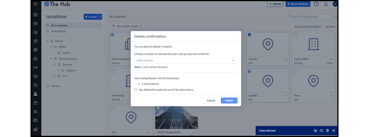 When you delete a location, all its associated components—like users, groups, and content—will be affected.