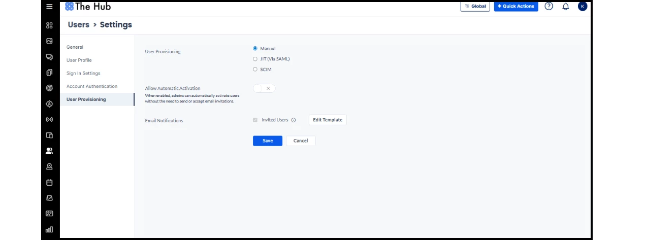 - Change the User Provisioning option to Manual from SCIM or JIT.