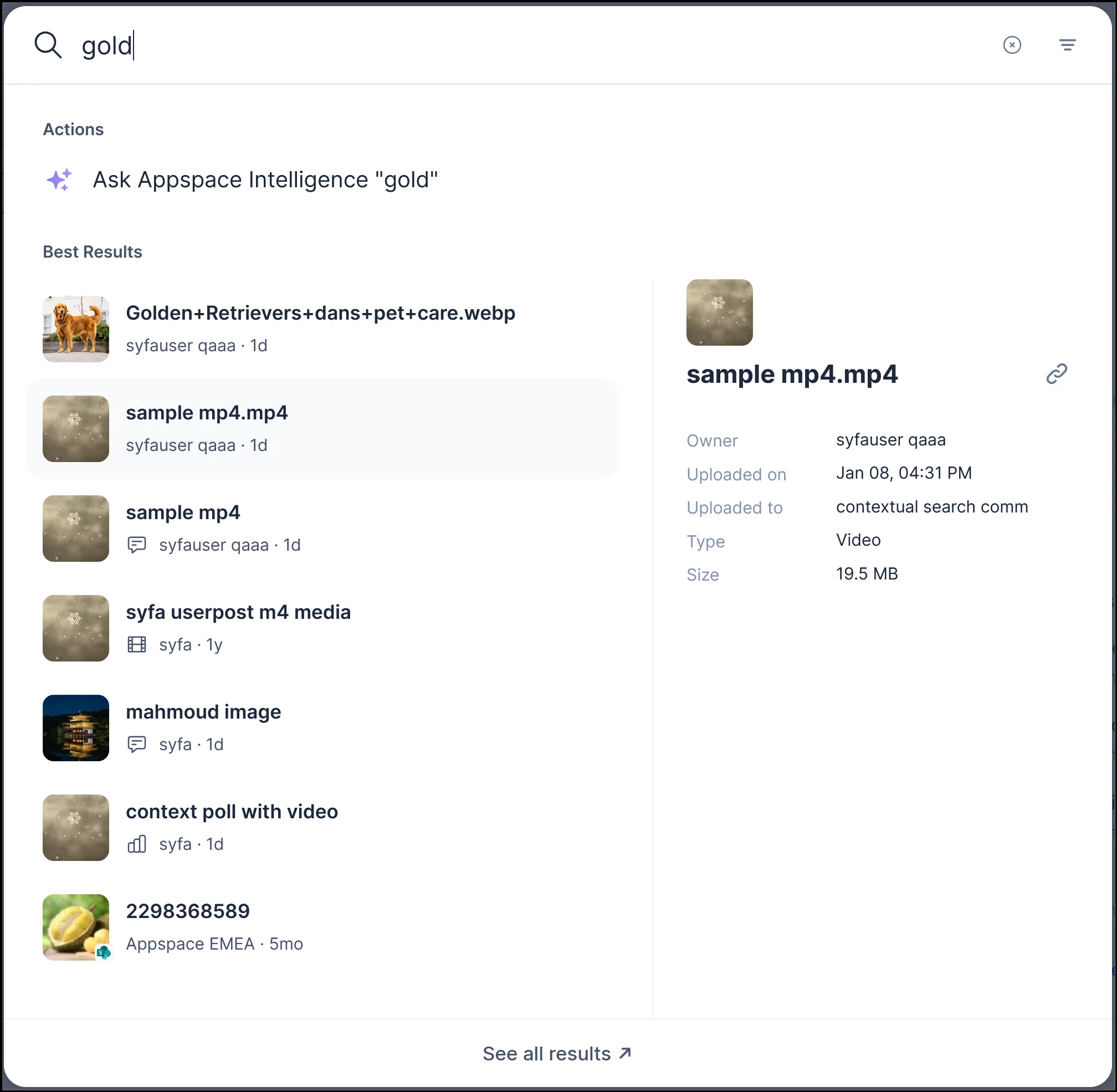 - AI-Generated Semantic Descriptions: Appspace Intelligence processes files to generate semantic descriptions that power more accurate, context-aware search results.