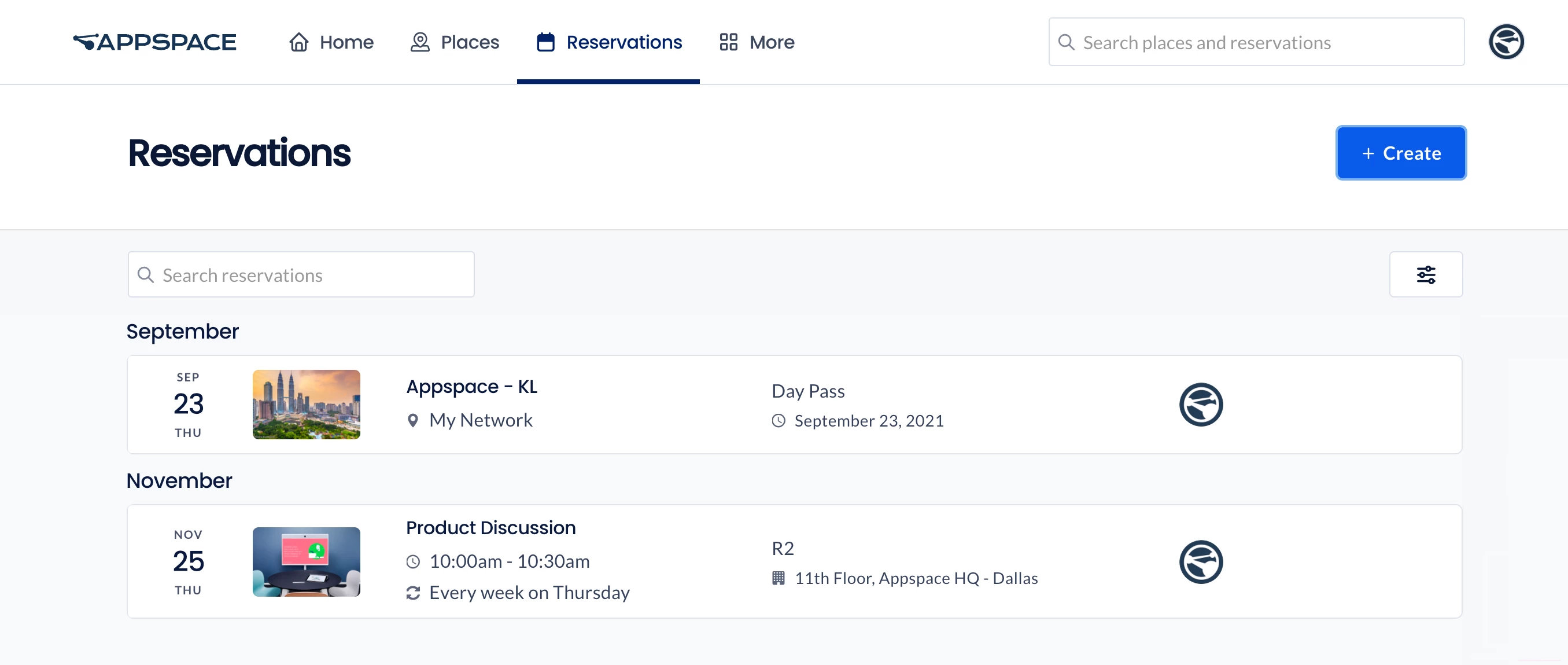 - Search – Type in a letter or keyword to search for a workspace or reservation.