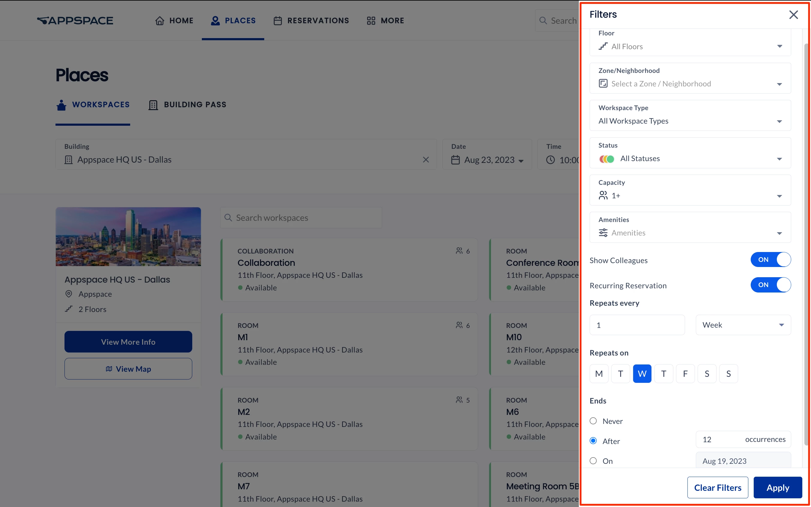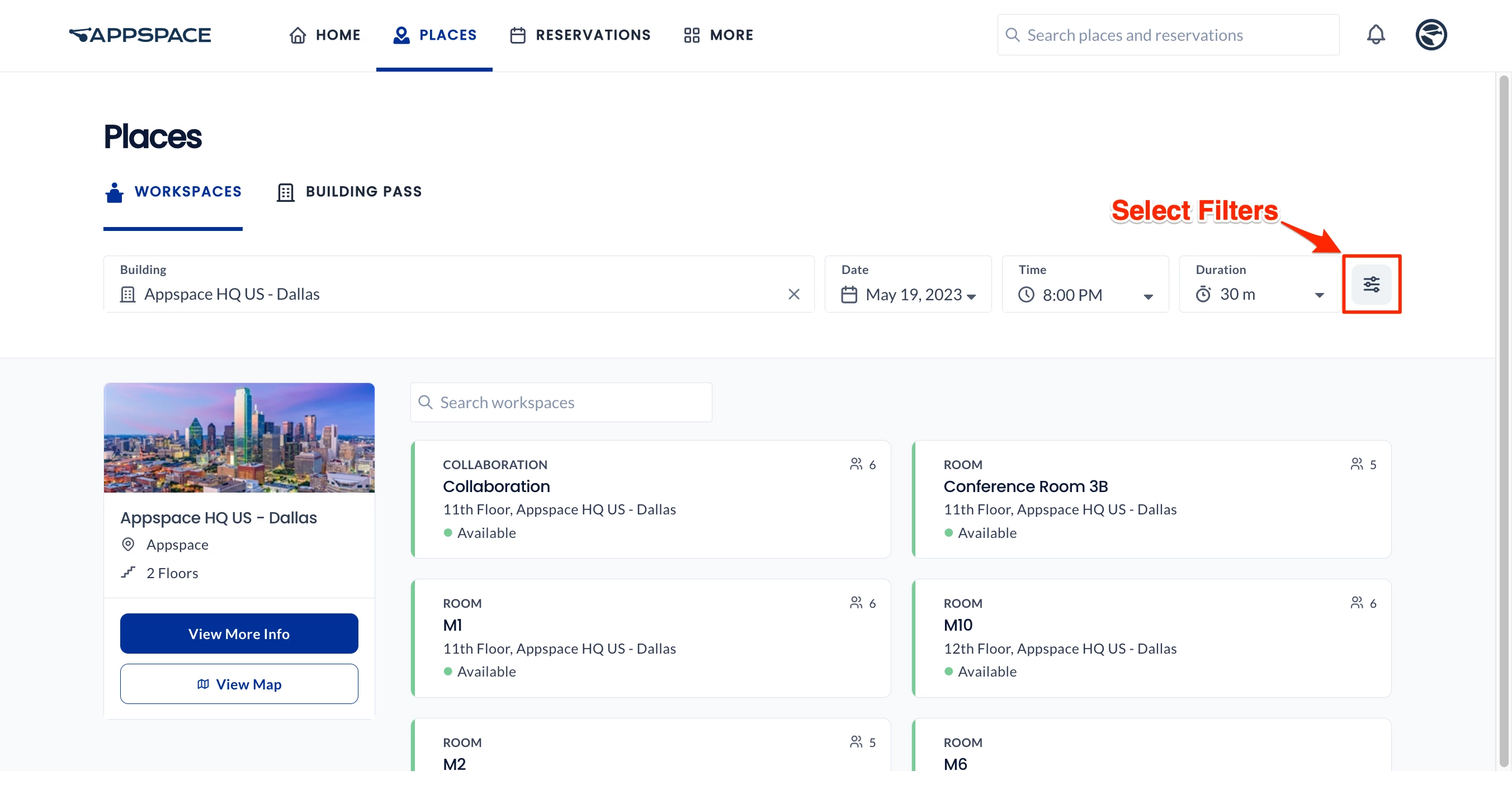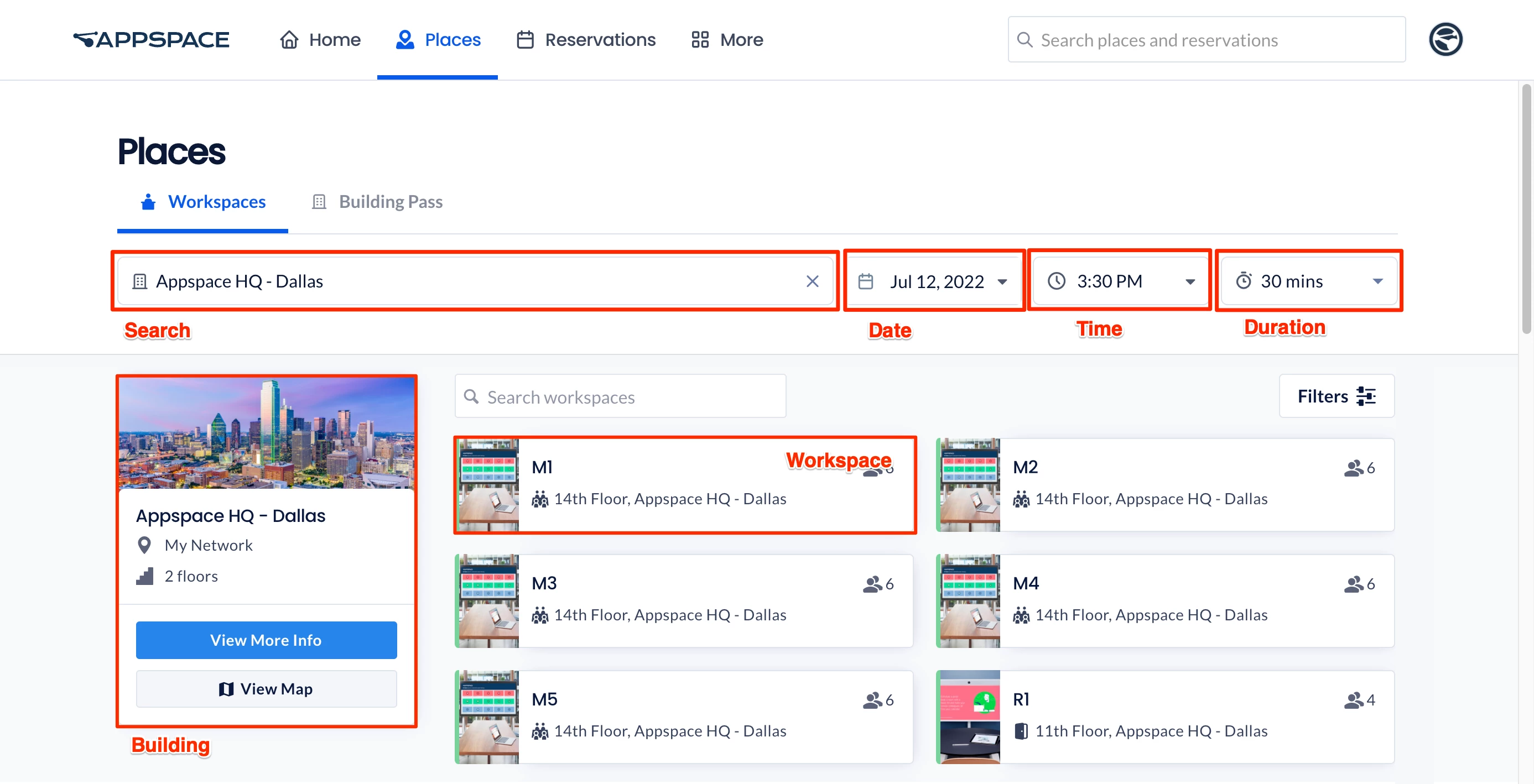 - Click View Workspaces to search and view available workspaces inside the building and create a workspace reservation. Refer to the Reserve Workspace article for more information.