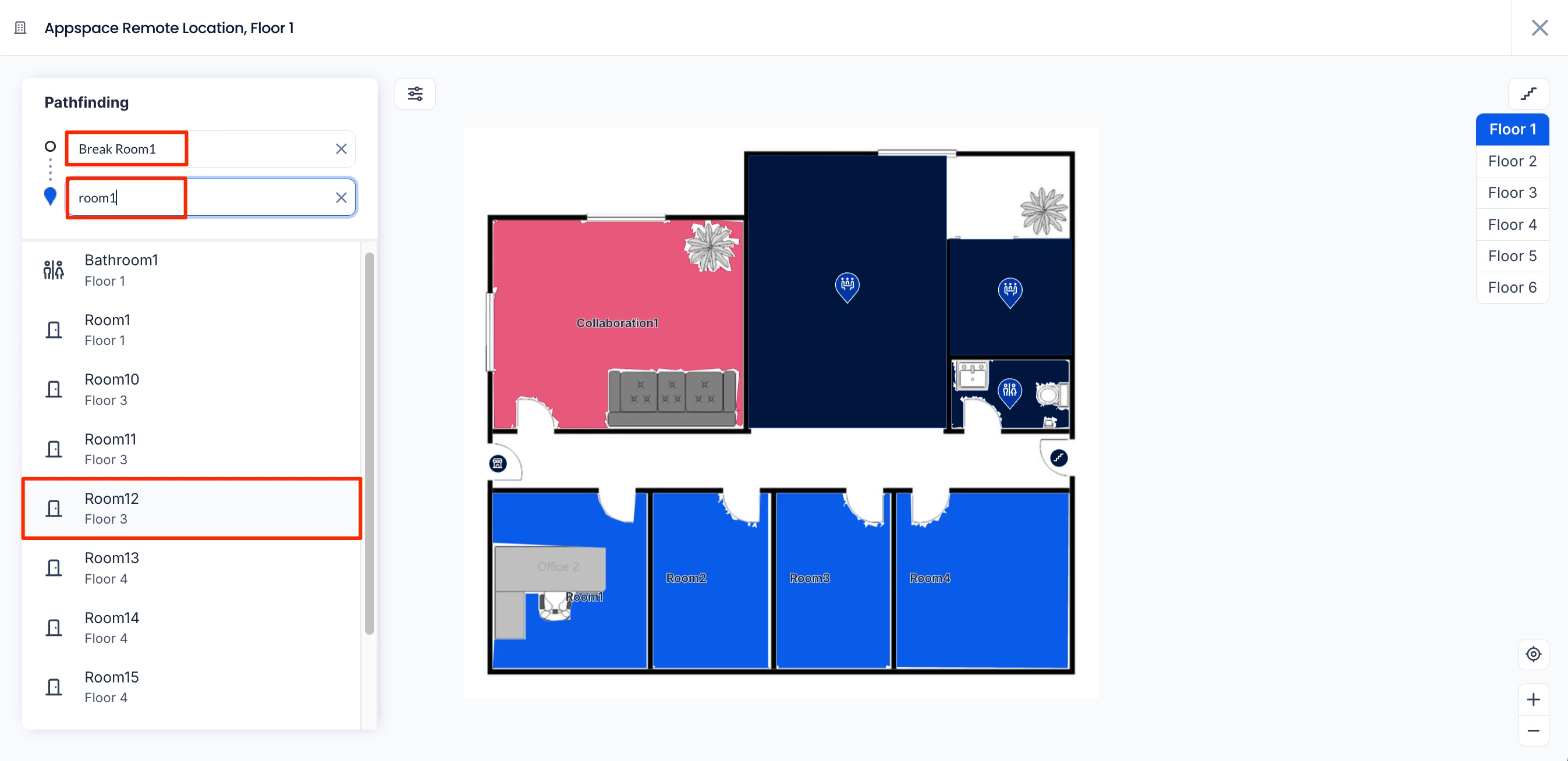 Perform the following steps to use the pathfinding feature to display directions to a resource, such as rooms, workspaces, and points of interest (POI), on the floor map of a building.