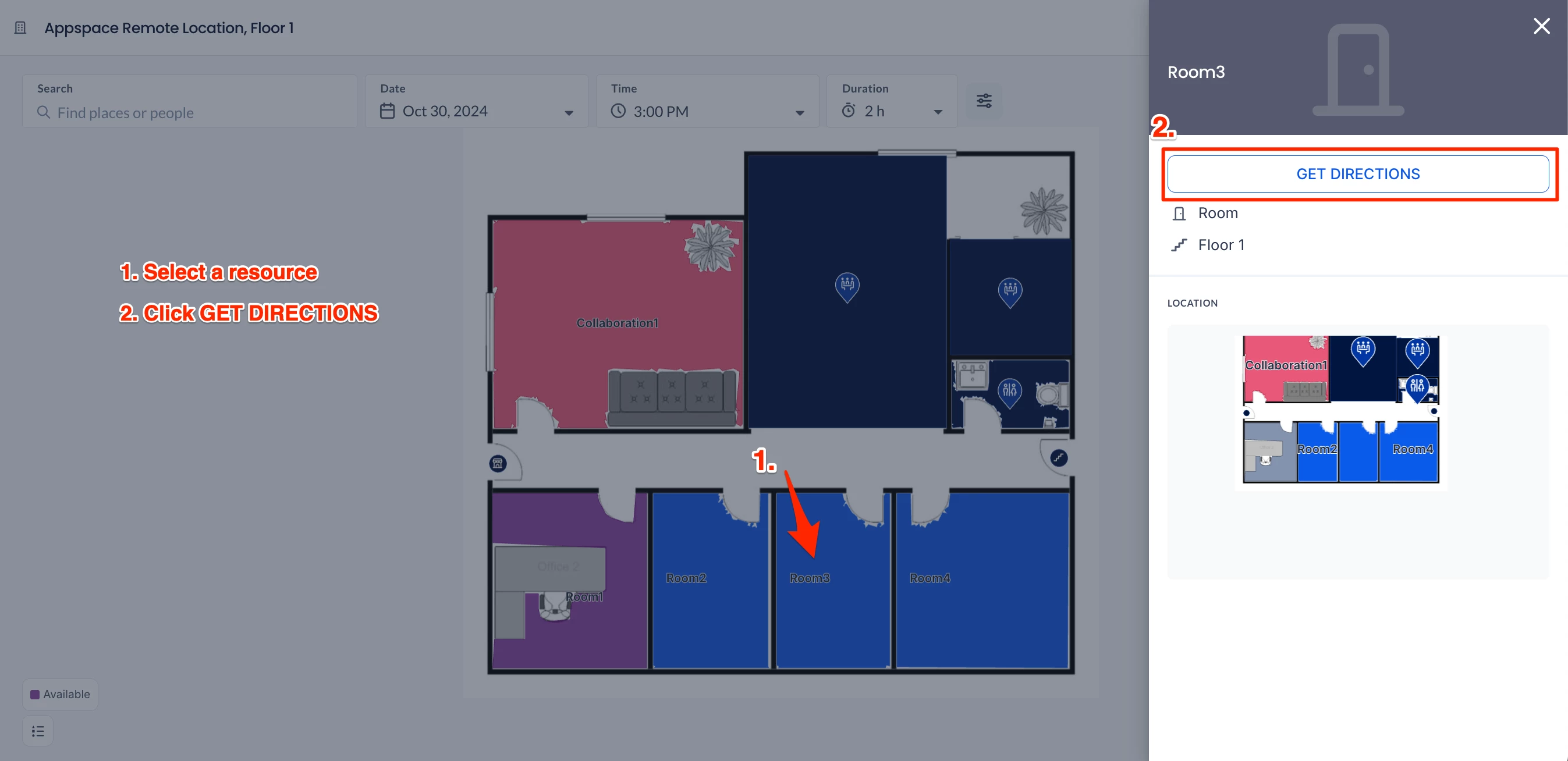 - Use one of the following methods to select available resources, such as rooms, workspaces, and points of interest (POIs).