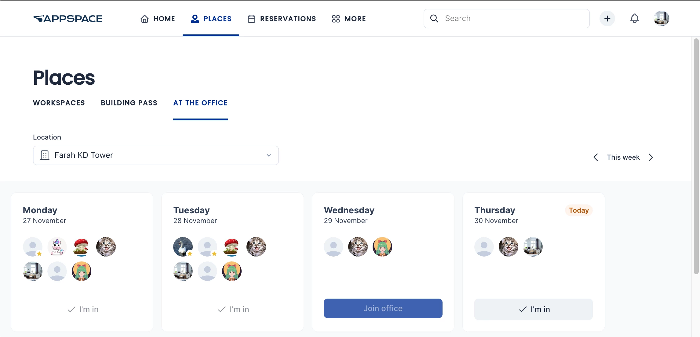 The I’m in option will be available on the days that have a reservation that you are attending for that week, while the Join Office option is displayed on the days you do not have a reservation.