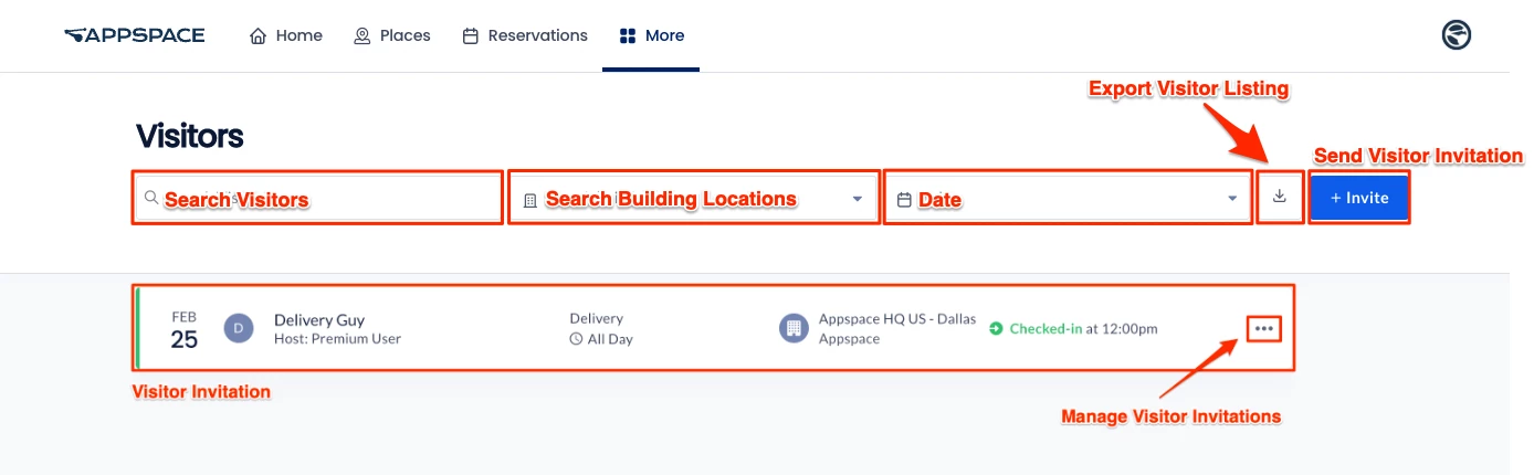 The Visitor dashboard displays the Visitor Management system used to invite external users (visitors) to a meeting or event held at your company. These visitors could be an employee from another facility, division, or subsidiary within your company or other corporate entities from outside the company. Event Hosts and Facilitators may do the following:
