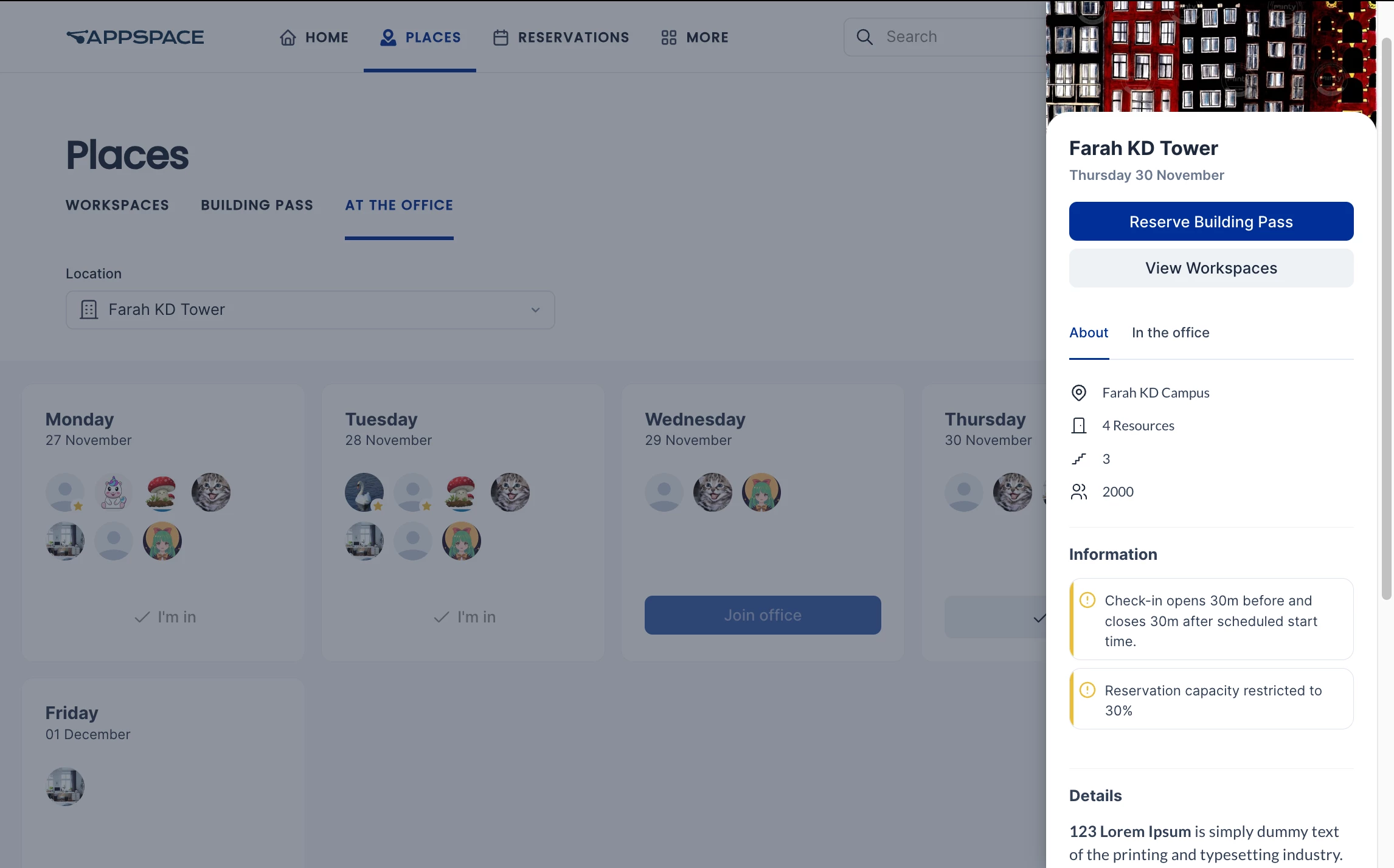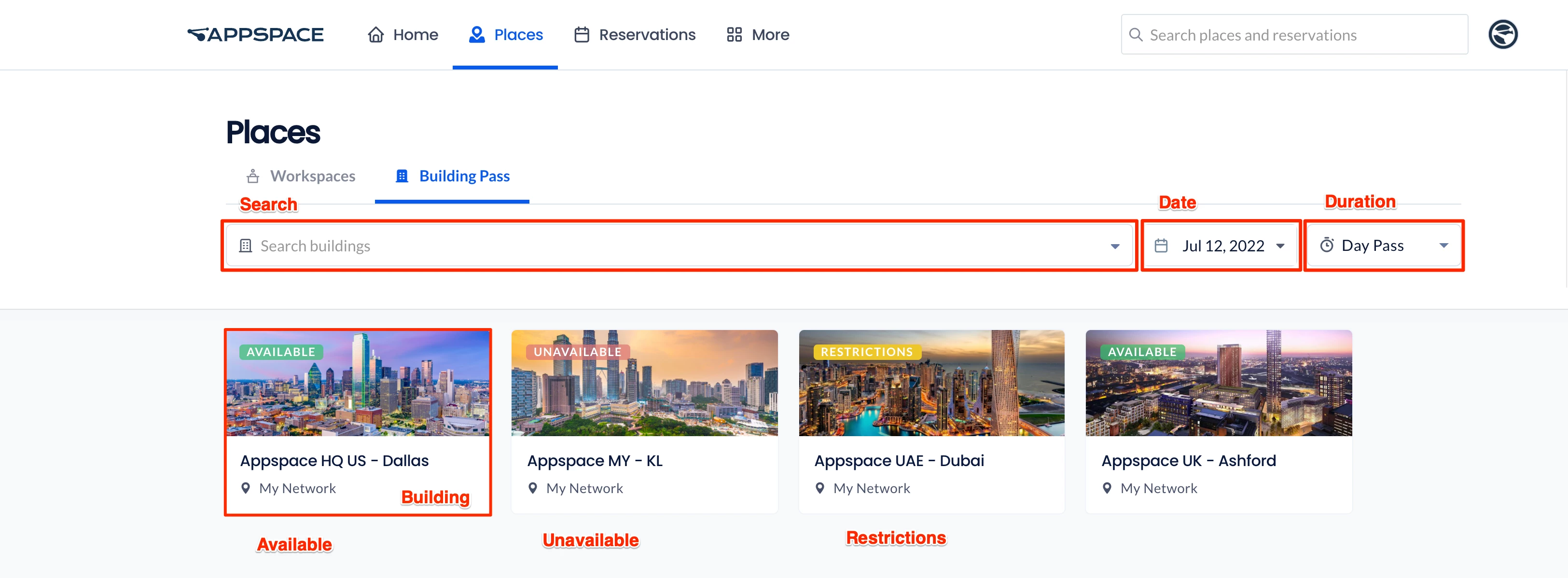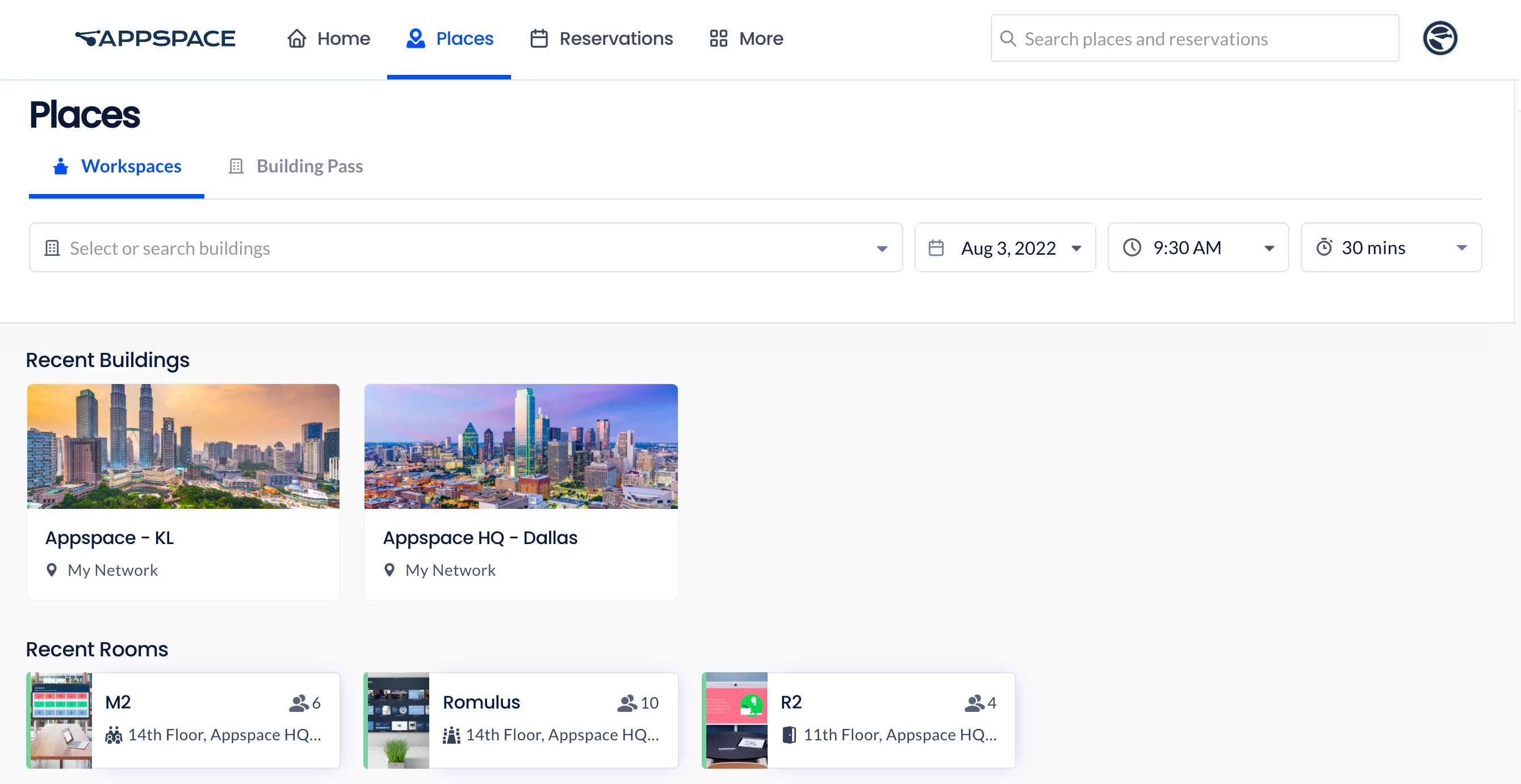 The Places tab includes three sub-tabs: Workspaces (default selected), Building Pass, and At The Office.