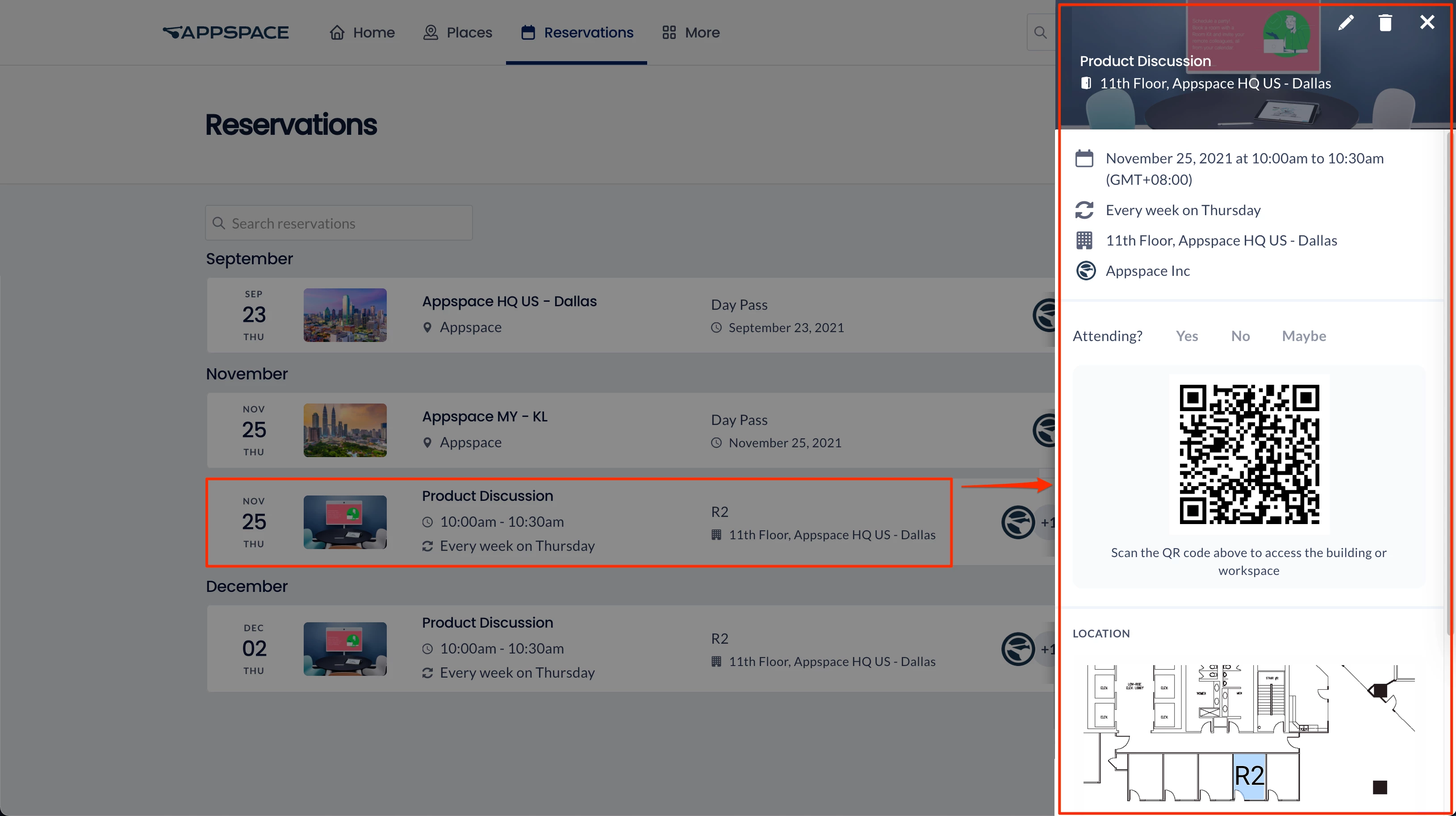 When you select a building pass or workspace reservation, you may view the resource details, booking details, and the resource’s location on a map (if available). If you are assigned as an approver for a resource (such as location, building, workplace, or room) you are also able to view pending reservations and approve or decline them.
