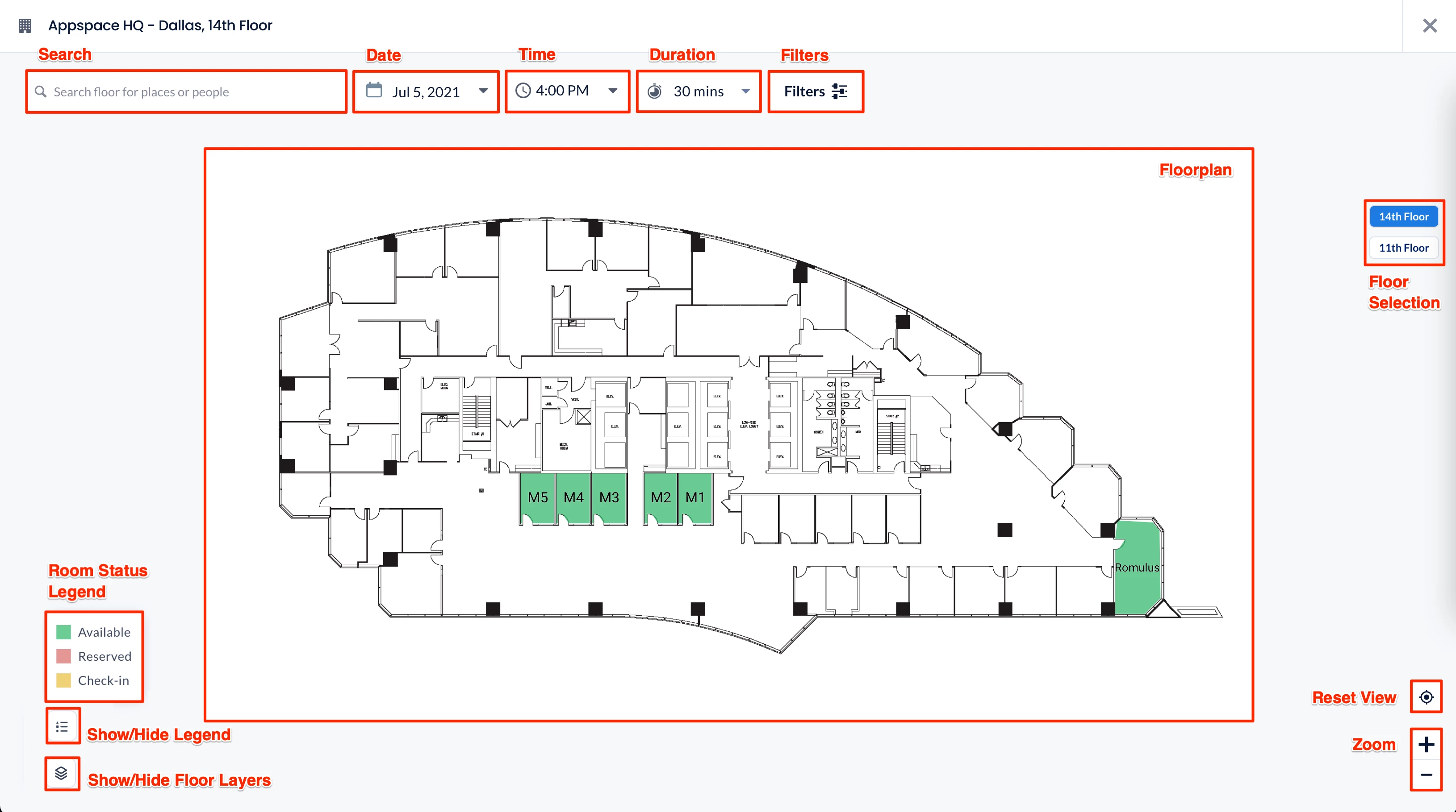 - View Map – Click this button to display the floorplan in map view. The floorplan will display all available workspaces and resources on the selected floor (if applicable).