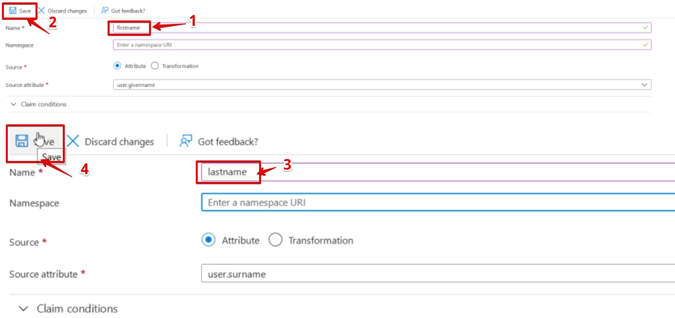 Remove any existing additional claims. Add new claims for firstname and lastname, ensuring the Namespace field remains blank for both.
